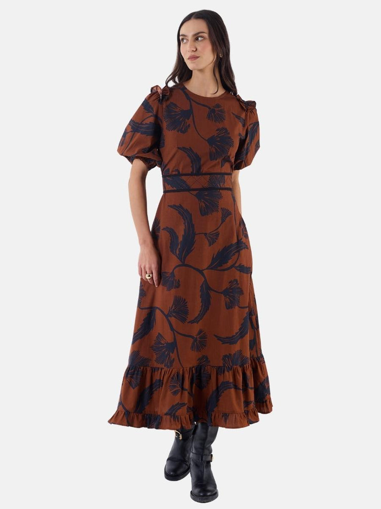 The Antonia is a wonderful choice for special occasions and everyday agendas alike. Cut with puffed sleeves, elastic cuffs and adorned with subtle frills, the Antonia falls to a slender A-line creating a flattering silhouette. Accentuate the waist with the featured belt. Antonia is crafted from crisp cotton poplin, breathable and soft against the skin. ‘Noir Bloom’ captures the graceful interplay of shadows formed by leaves and florals under the fading light of the setting sun.