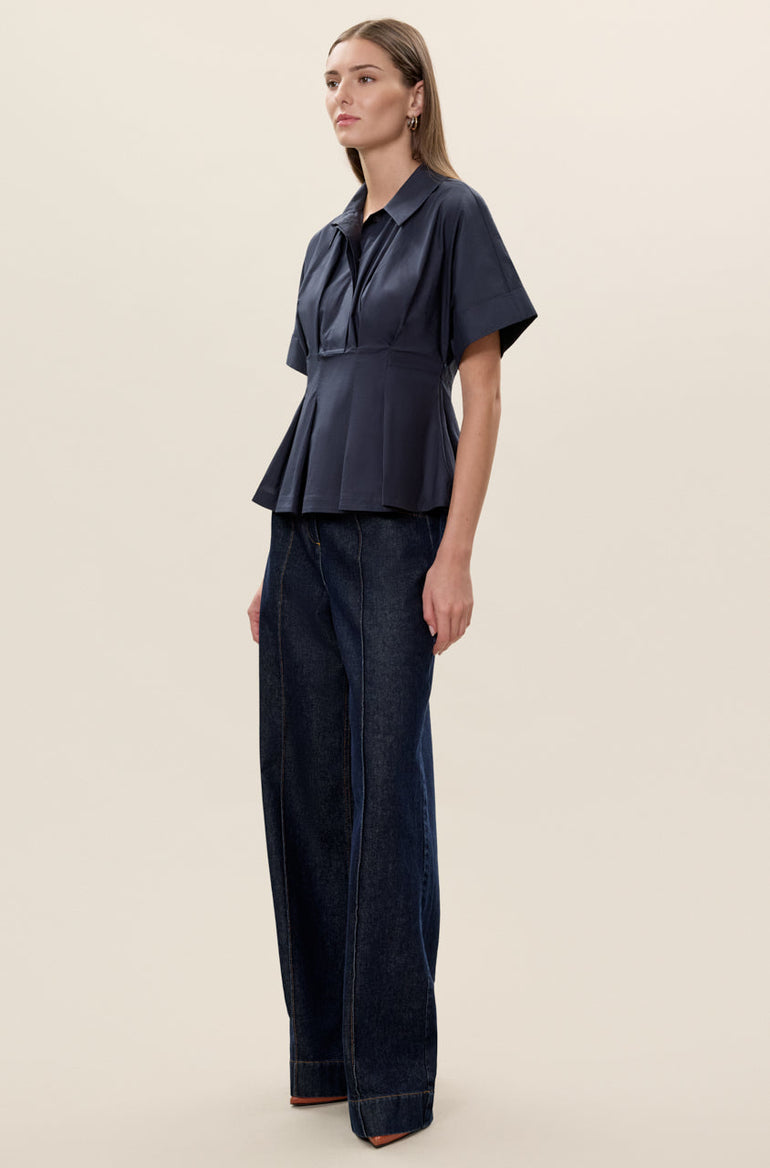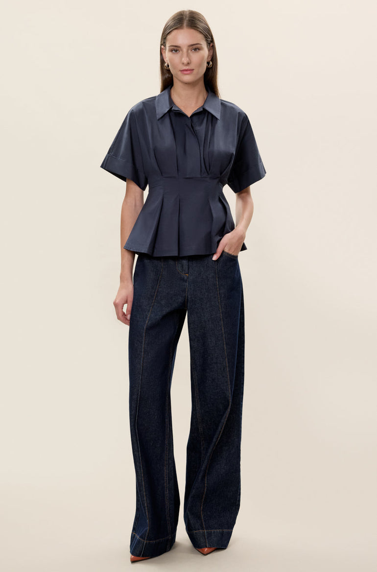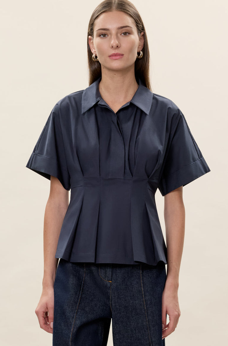 An updated take on one of our best-selling silhouettes, now in a new navy. Cut from crisp cotton poplin, this tailored short-sleeve peplum top features sharp pleats through the waist for structure and shape. The fit is clean and flattering. Wear it with wide-leg denim, tailored trousers, or layered under a jacket—it's easy to style and made to work hard in your wardrobe.