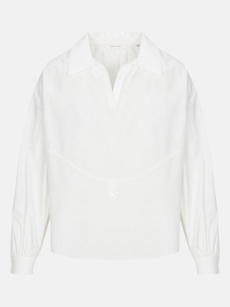 A crisp cotton poplin blouse designed with soft structure and refined ease. The open neckline is framed by a gently curved collar, bringing a subtle femininity to the clean silhouette. Full sleeves with pleated volume and tailored cuffs add quiet detail. Available in white and chambray, it’s an easy staple that pairs well with denim, trousers, or layered under a jacket.