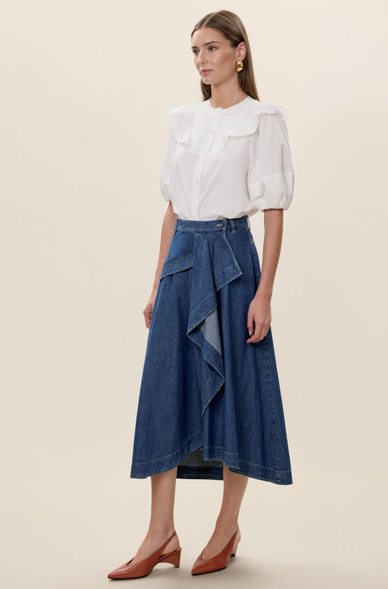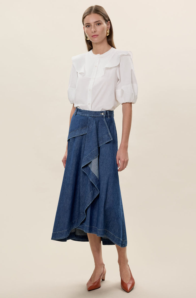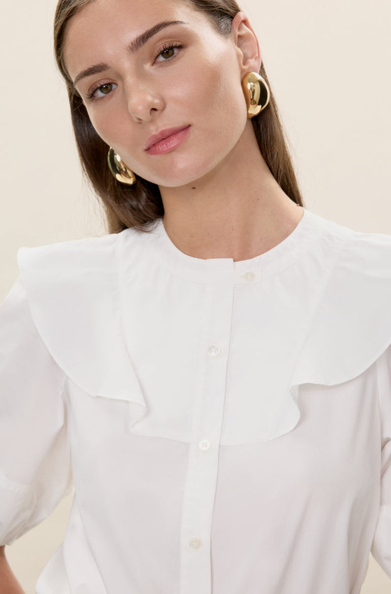 A crisp cotton poplin top designed with sharp yet soft proportions. The sculpted bib collar and short puff sleeves bring volume and shape to the otherwise clean silhouette. Finished with a button front and subtle gathering through the sleeve, it’s a fresh update to the classic white blouse—structured enough to tuck into trousers, soft enough to wear on its own.