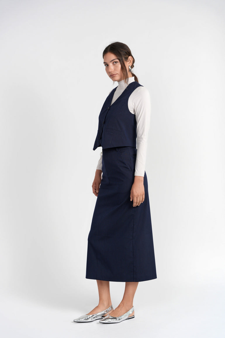 The Alex Vest is sharply tailored from classic navy pinstripe suiting fabric, offering a polished, menswear-inspired look with a modern edge. Its structured silhouette and front button closure create a refined finish, while subtle seaming and a clean neckline add definition and shape. Designed to pair seamlessly with the matching Alex Skirt, this versatile vest stands out whether worn layered or styled solo.