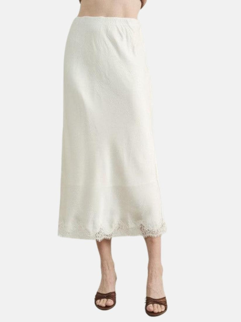 Elevate your collection with this chic satin skirt, Featuring a subtle textured design, the skirt is finished with a delicate lace trim for a touch of elegance. Its sleek silhouette and maxi length make it a versatile piece.