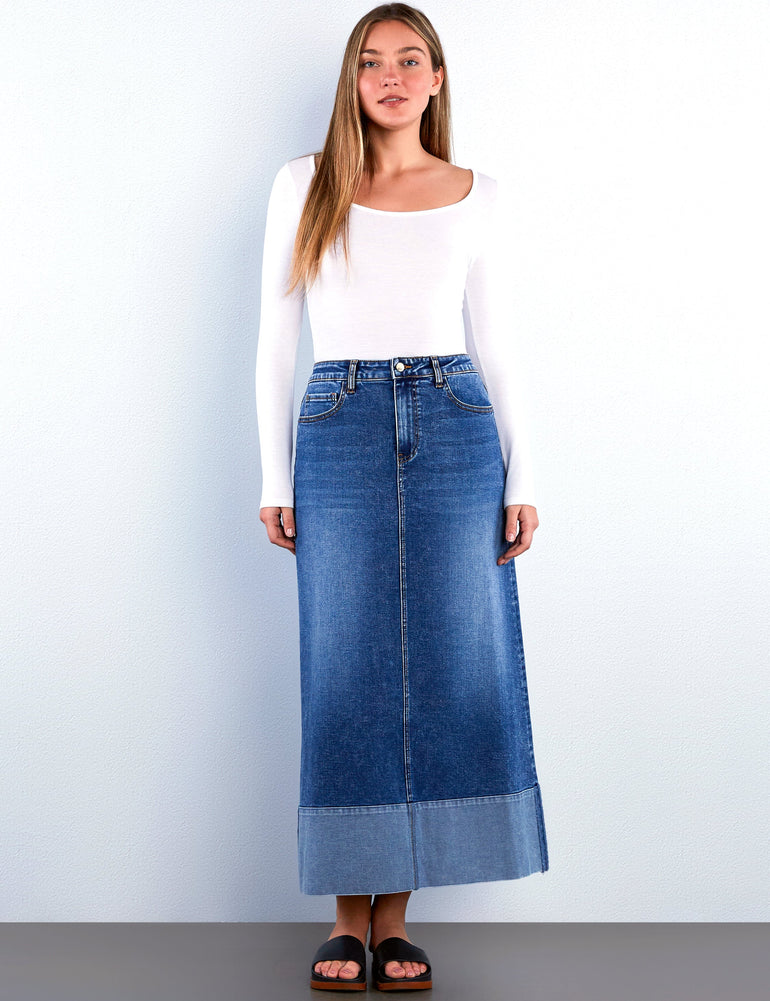 We thought, "let's have some fun with our classic maxi." So we did. It's the Cuffed Denim Maxi Skirt from Wash Lab – full of style, and making smiles, wherever you wear it.