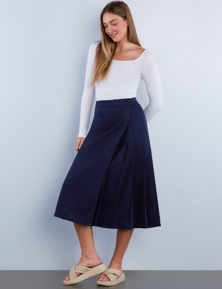 The Delphine Side Pleat Maxi Skirt just exudes cuteness, with its adorable side-pleat construction and oh-so-soft premium denim.