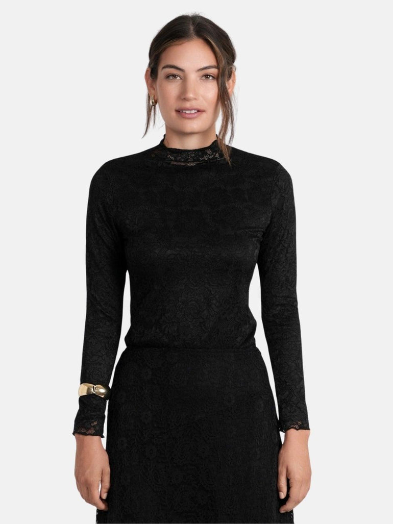 - The Elle Top is a fitted mock-neck crafted from delicate lace that mirrors the skirt's intricate texture.