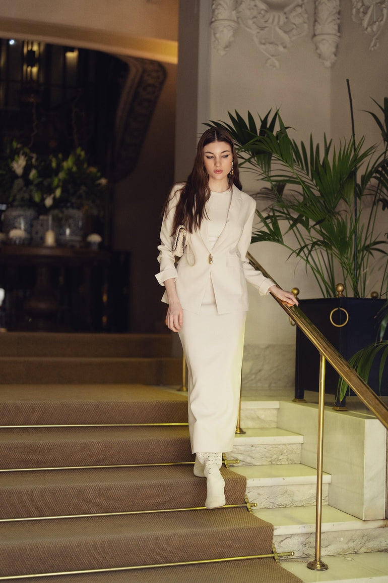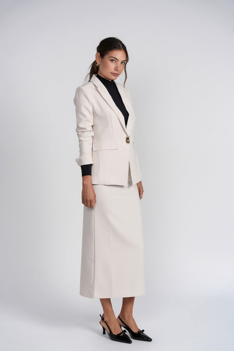 - Its clean lines and tailored silhouette create an elongated, polished look that pairs effortlessly with the Gwen Blazer for a sophisticated set.