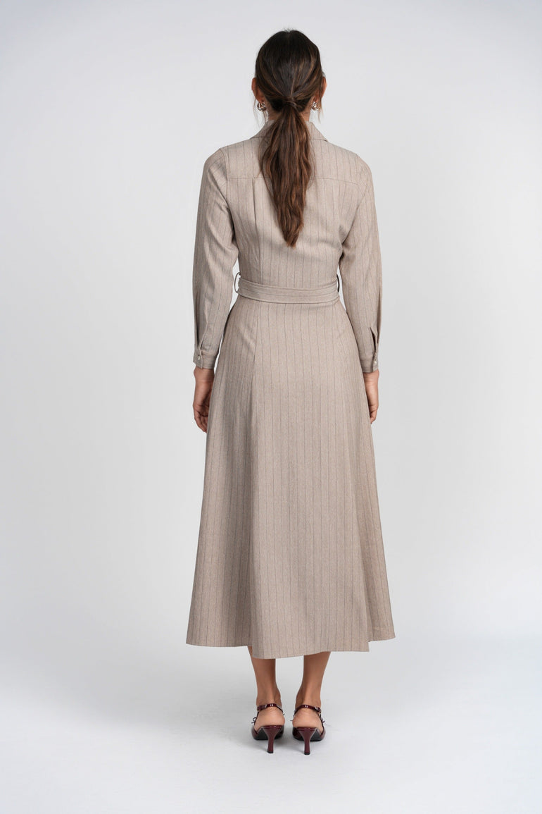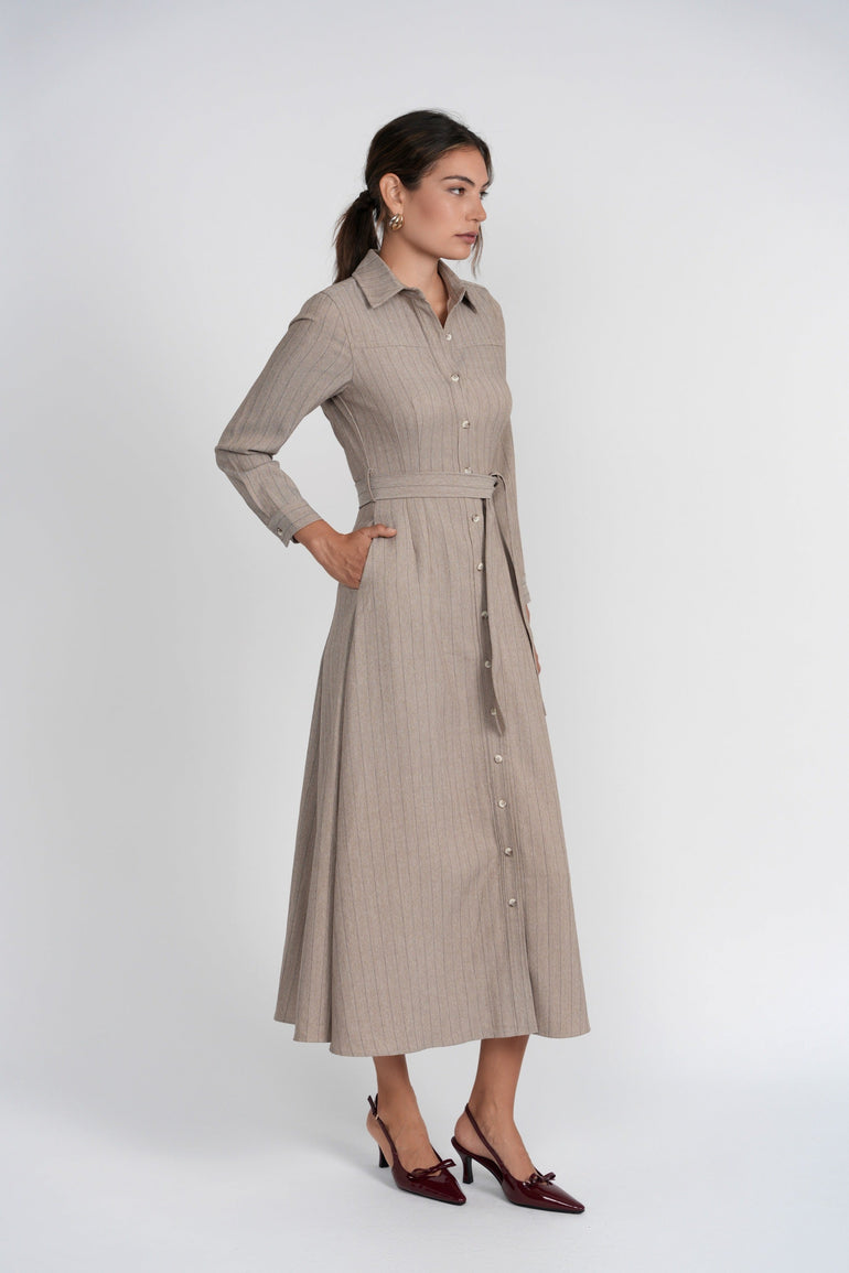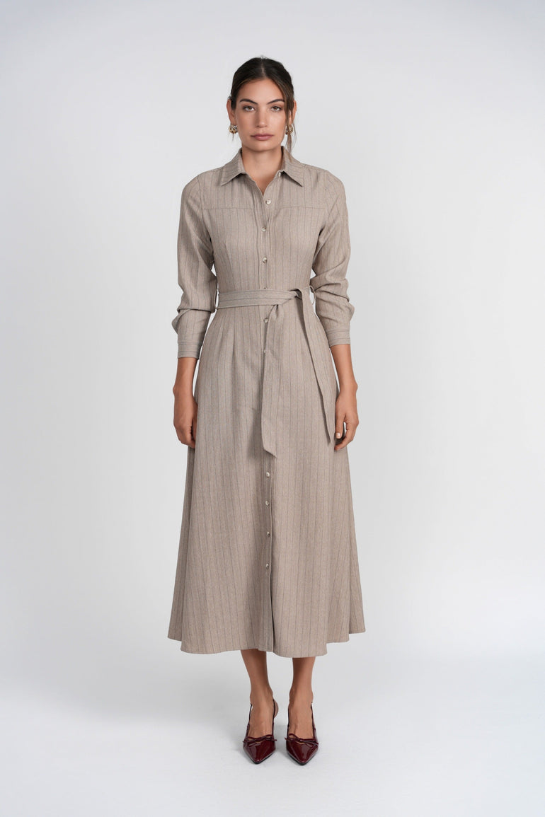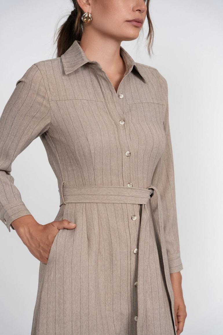 - Featuring a crisp collar and a full button-down front, it's cinched at the waist with a self-fabric tie belt, creating soft structure and a flattering, elongated shape. The tailored details and fluid lines strike a balance between ease and sophistication.