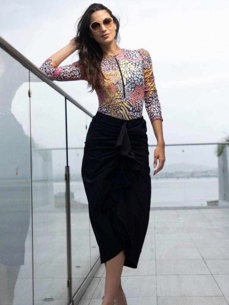 The JUNGLE GLAM SET is here to elevate your beach and pool vibes! This colorful and elegant bodysuit features elastic ruffle 3/4 sleeves that add a unique touch to your look. The front zipper allows you to adjust your neckline to your preference. Complete your beach look with the BELLA SKIRT, a pencil skirt that hugs your curves and adds a touch of style to your shoulders. Perfect for swim, beach, and vacation, this set is sure to make you stand out in the jungle!