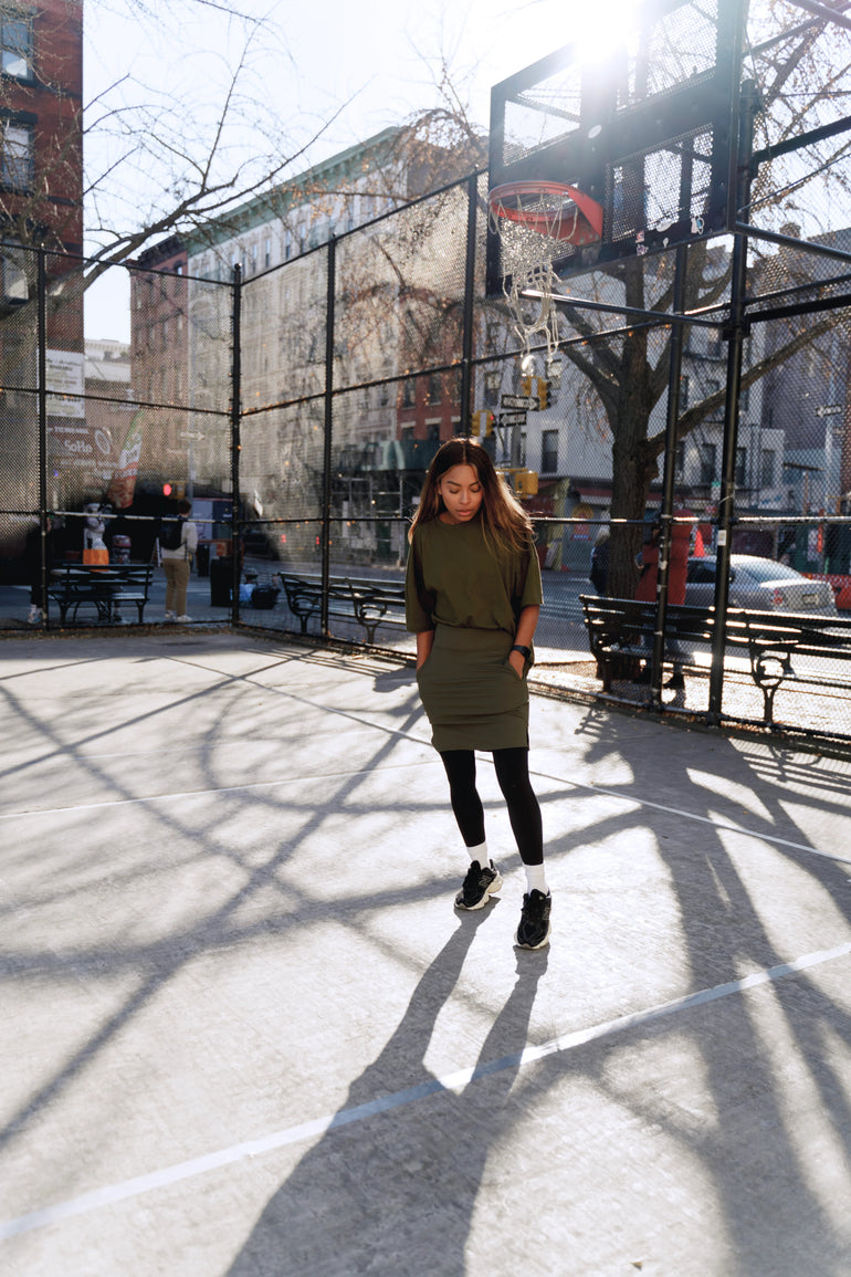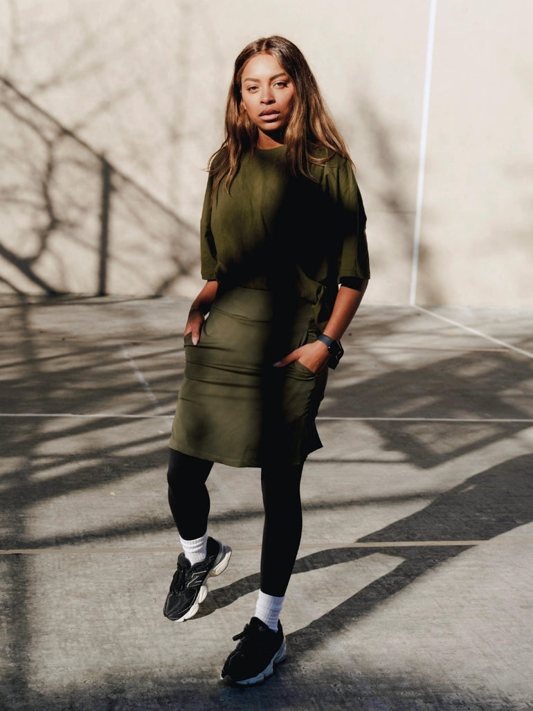 She styles the skirt with a high waist, yet you have the flexibility to wear the skirt lower on the waist if you desire extra length, providing more coverage for the knees.