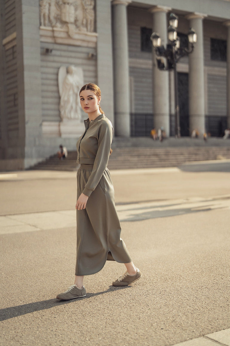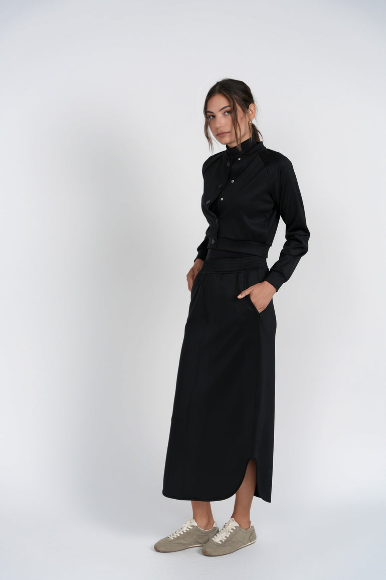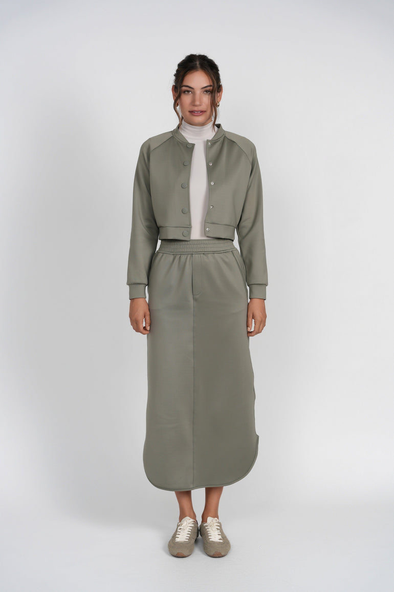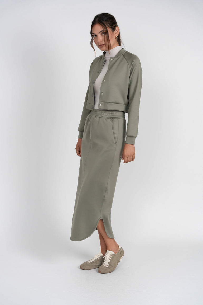 The Lottie Skirt is a sleek, straight silhouette crafted from structured scuba fabric, combining polished style with comfortable wear. Featuring an elastic waistband, it provides effortless fit and ease while maintaining a clean, modern line. Designed to pair perfectly with the Raven Bomber, this skirt is an elevated essential for chic everyday errands or casual city styling.
