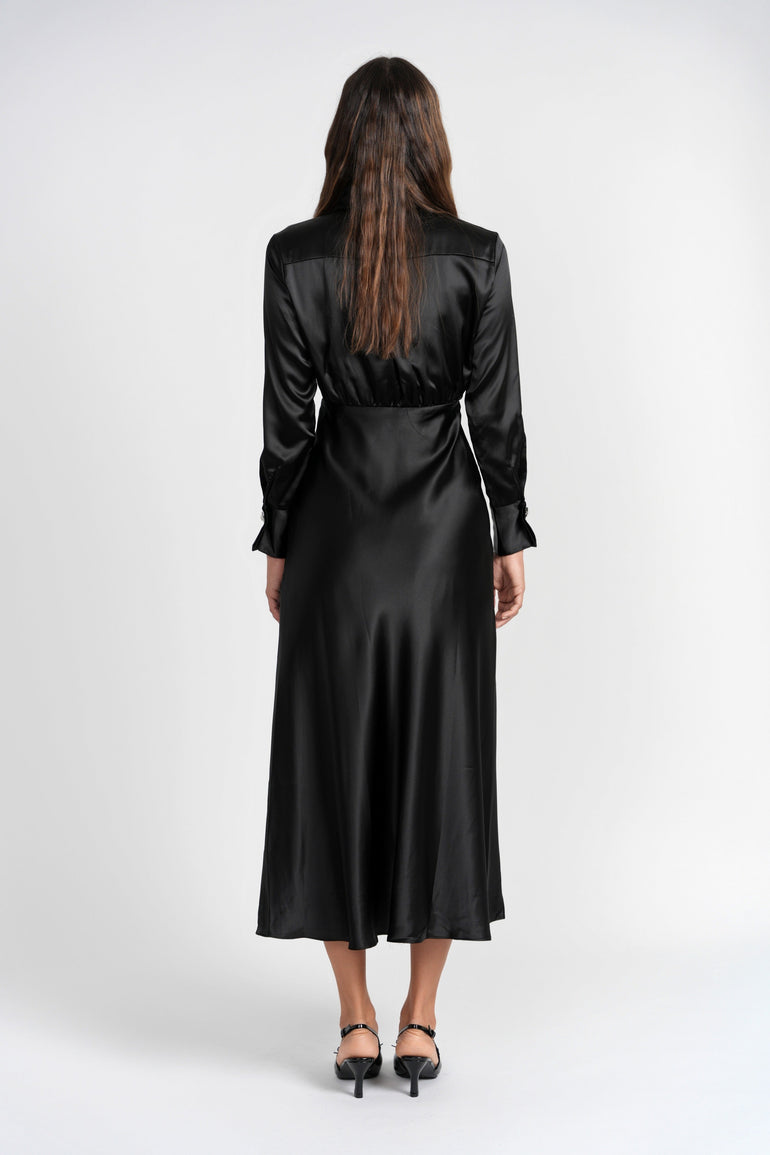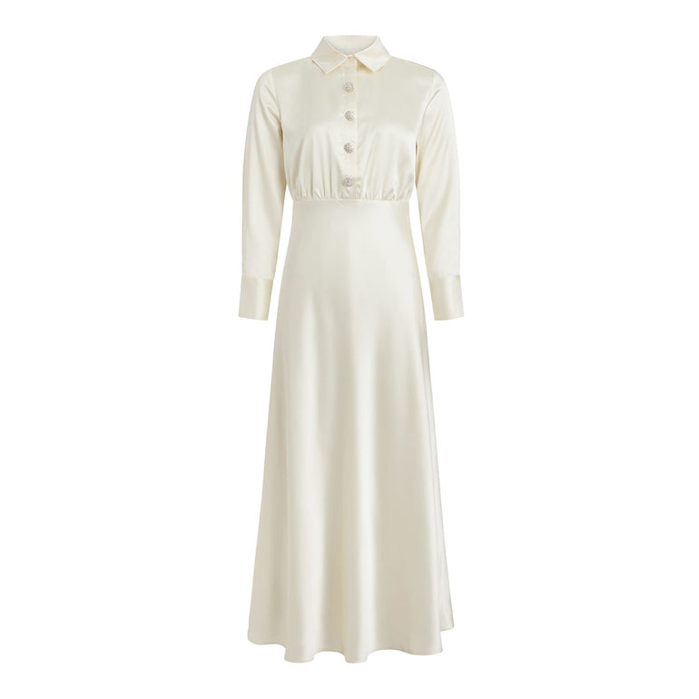 - The Seraphina Dress is crafted in an elegant ivory satin, designed with a blouson-style bodice that softly gathers into a fluid, straight-cut maxi skirt.