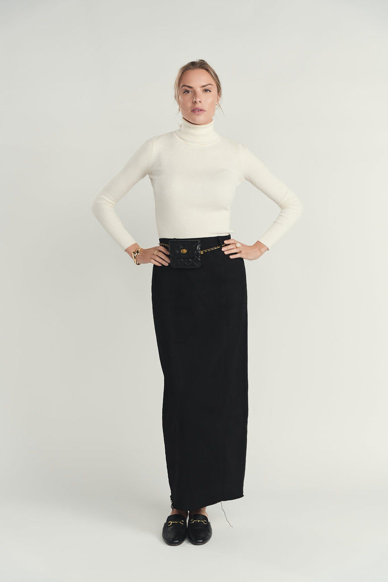 Sleek and versatile, the Straight Panel Denim Skirt in black is a timeless staple for your wardrobe. Cut in a flattering straight silhouette, this maxi-length skirt is designed with clean paneling for a polished finish. Made from structured denim, it offers a modern twist on a classic style, perfect for both casual and elevated looks.