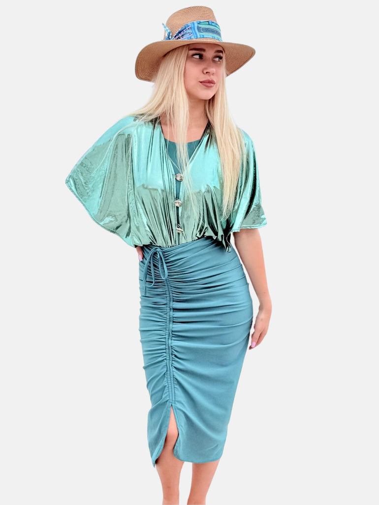 It’s paired with our signature Mahlia-inspired ruched skirt, now fully lined to ensure coverage—especially in lighter shades—so you can move with ease and confidence. Whether you’re headed to a beachside event, a resort weekend, or a dressed-up Shabbat, the Paloma delivers effortless elegance with every wear.