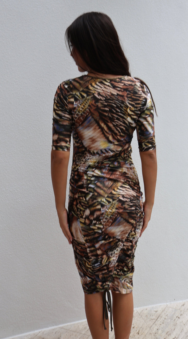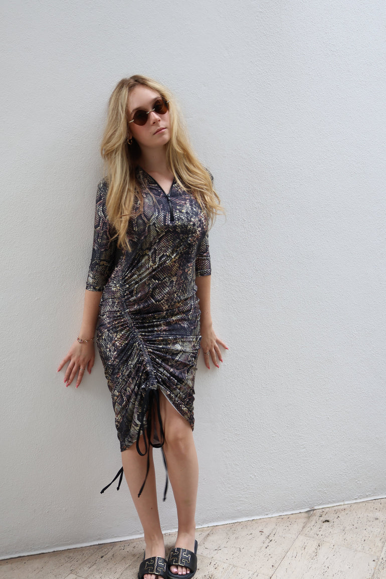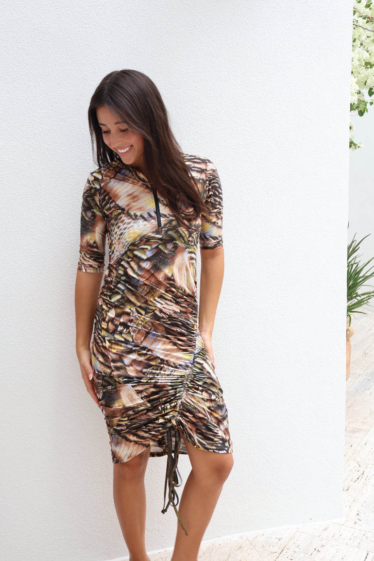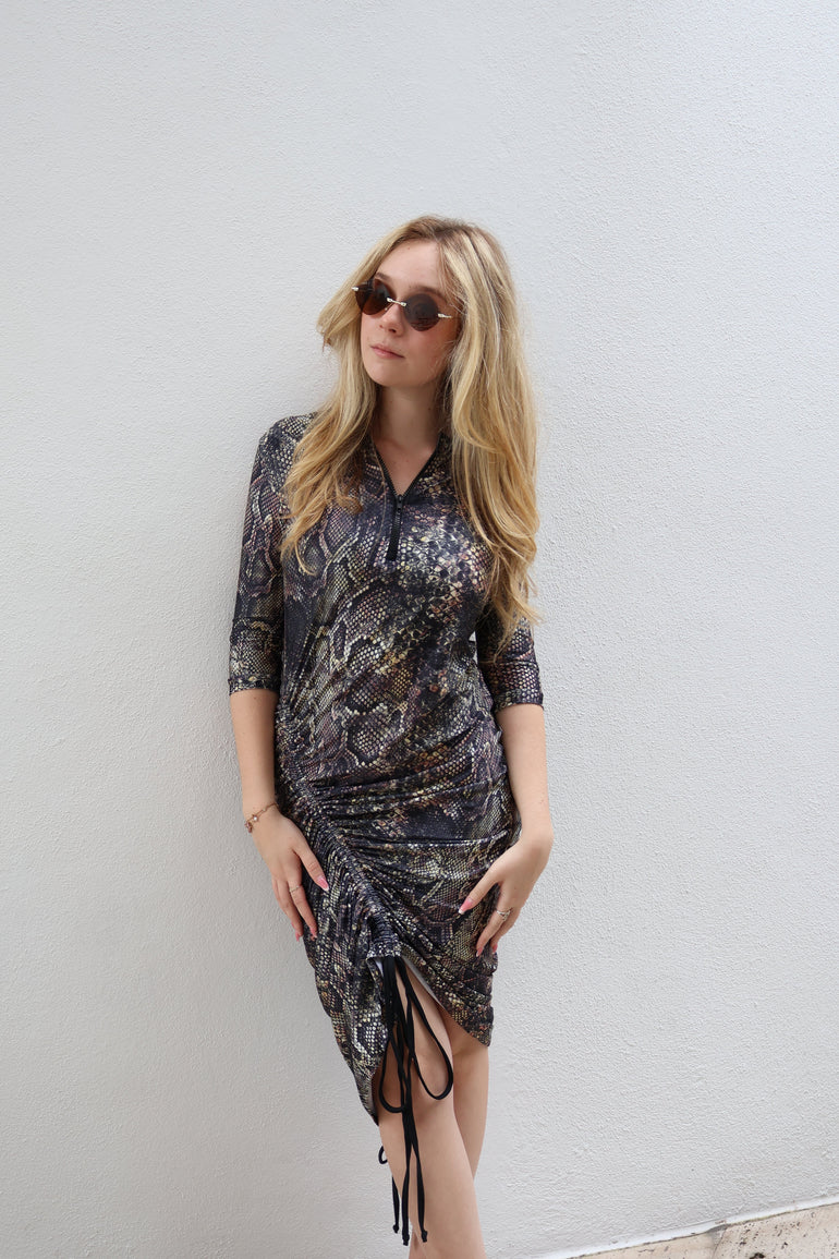 The standout feature is the asymmetric ruching detail, allowing you to wear it two ways: as a glamorous maxi or a playful mini, depending on your mood. Crafted from luxurious spandex with UPF 50 sun protection, this swim dress keeps you stylish and sun-safe—perfect for strolling the promenade, relaxing poolside, or enjoying a day at the beach.