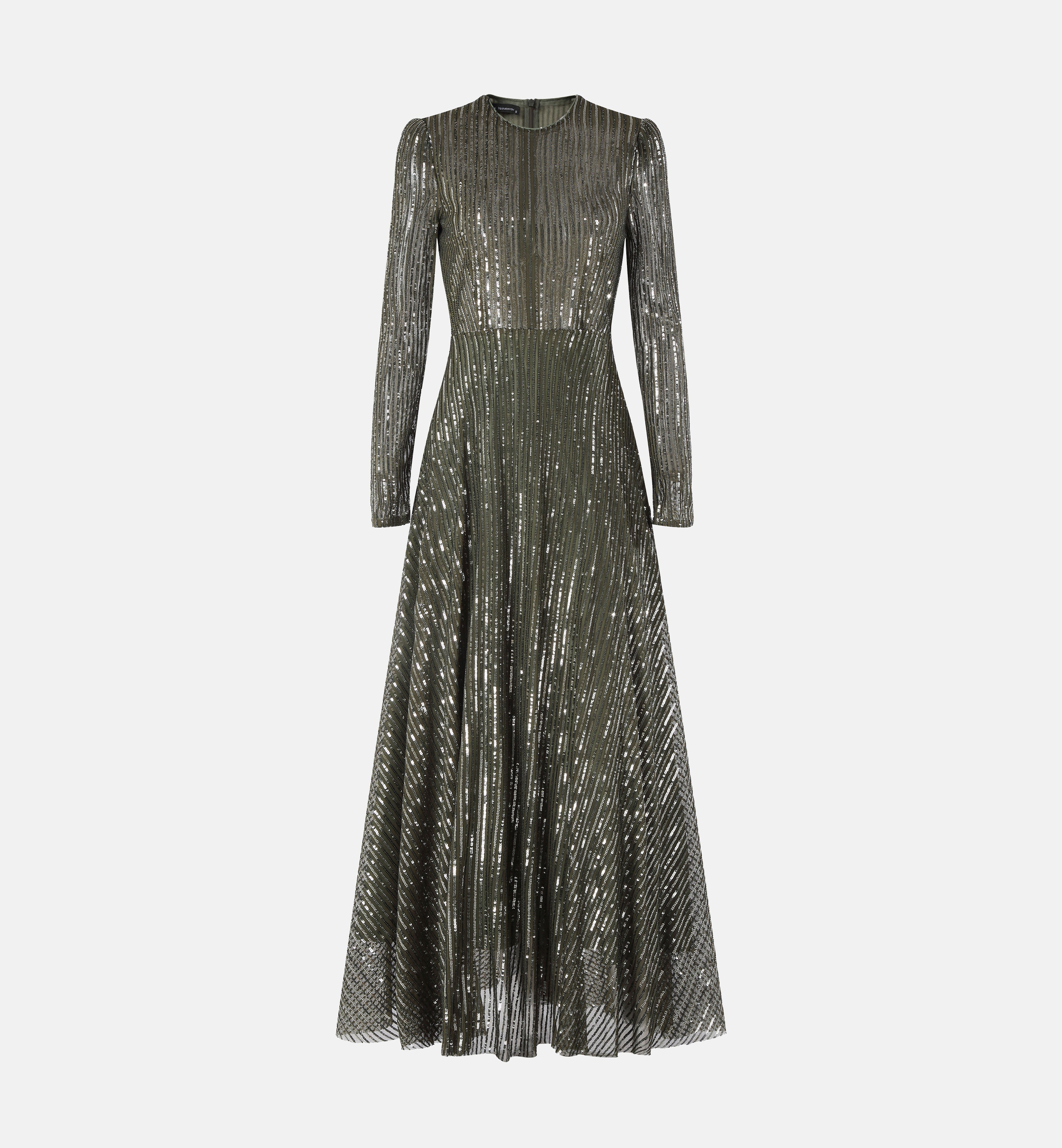 Collared Embroidered Taffeta Miidi Dress in Bronze