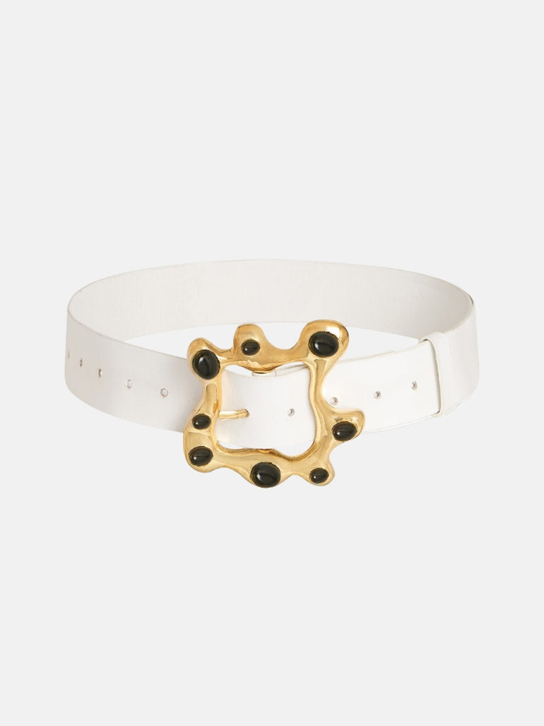The oversized buckle belt is crafted from supple genuine leather with an oversized brass buckle with Black Onyx Cabochon