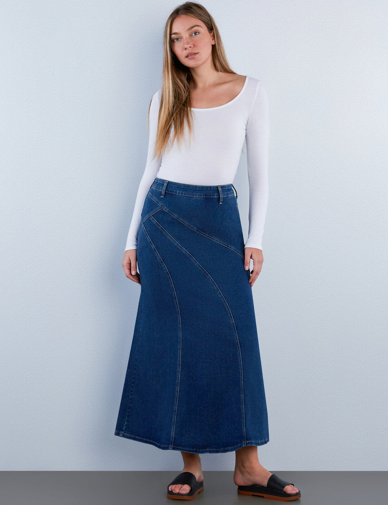This Midi is a pure piece of art, with its mod-inspired pieced construction, made-for-you cut, and gorgeous wash. That's the Wash Lab Desi Denim Midi Skirt, ready to show.