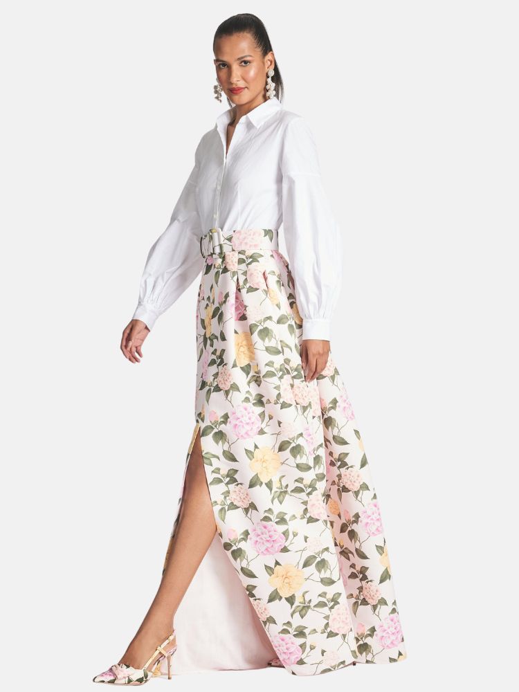 Florence is classic. The Indian cotton bodice features a slight cut-away at collared neck, round pearl buttons down the center front, and lantern sleeve with invisible stitching to create that dramatic shape. The bottom of this gown is our Pink Lemonade Bouquet print, the colors inspired spring and summer when its in full bloom. The two pieces are met in the middle with a printed belt for a flattering, waist-cinching look.