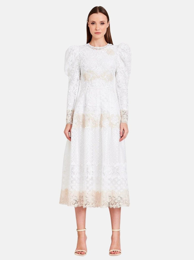 Romantic and effortlessly chic, this midi dress blends delicate lace panels with a soft beige and white palette for a refined, feminine silhouette. The combination of textures adds depth and movement, making it perfect for daytime events or special occasions that call for understated elegance.