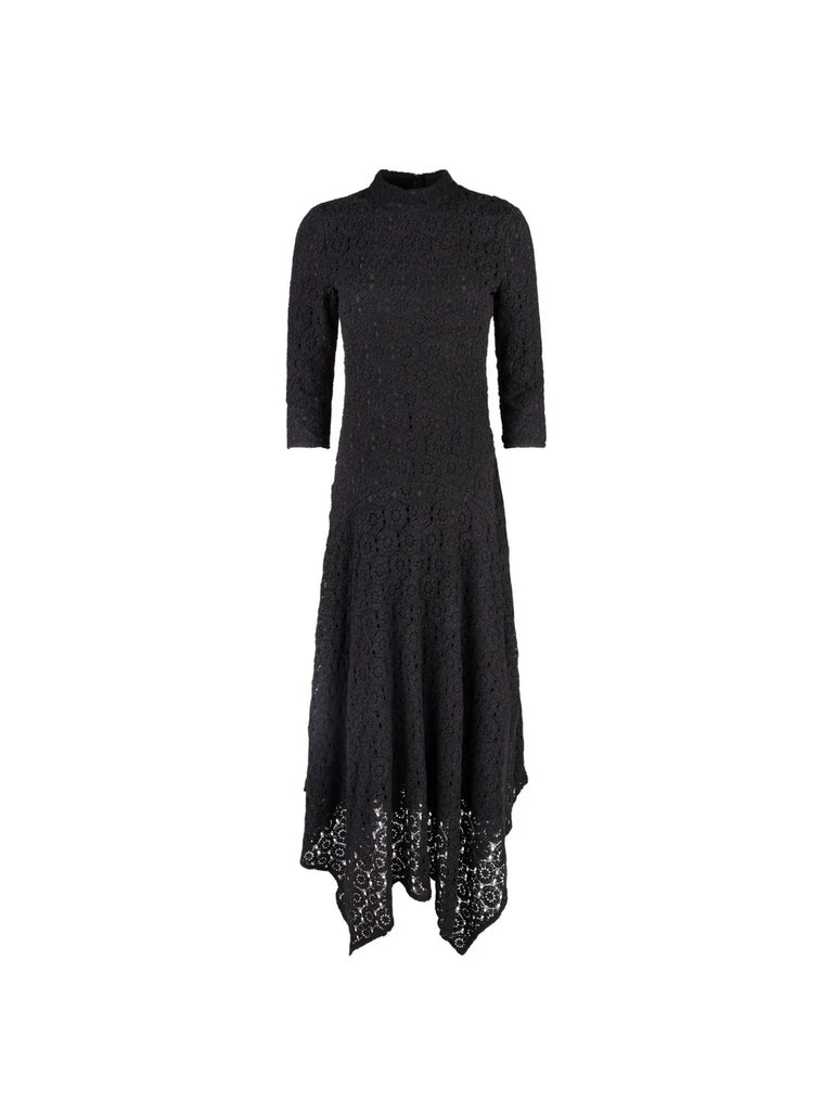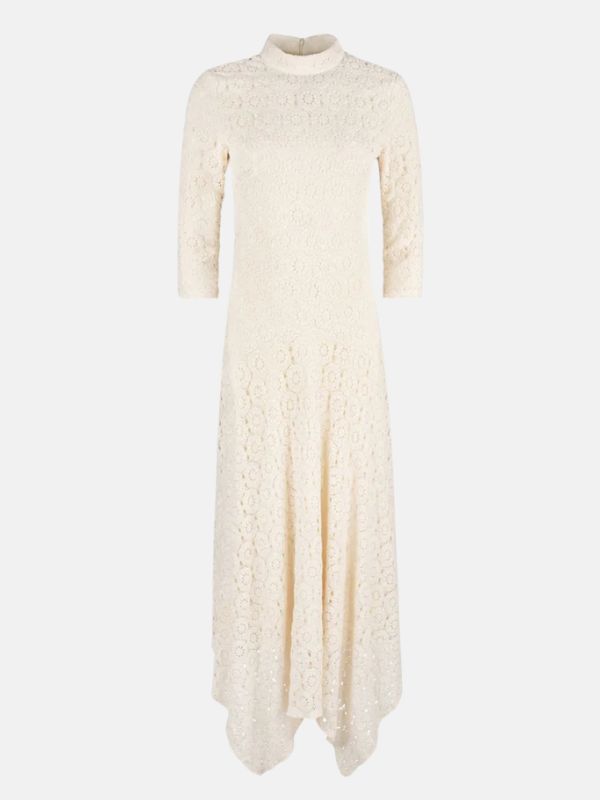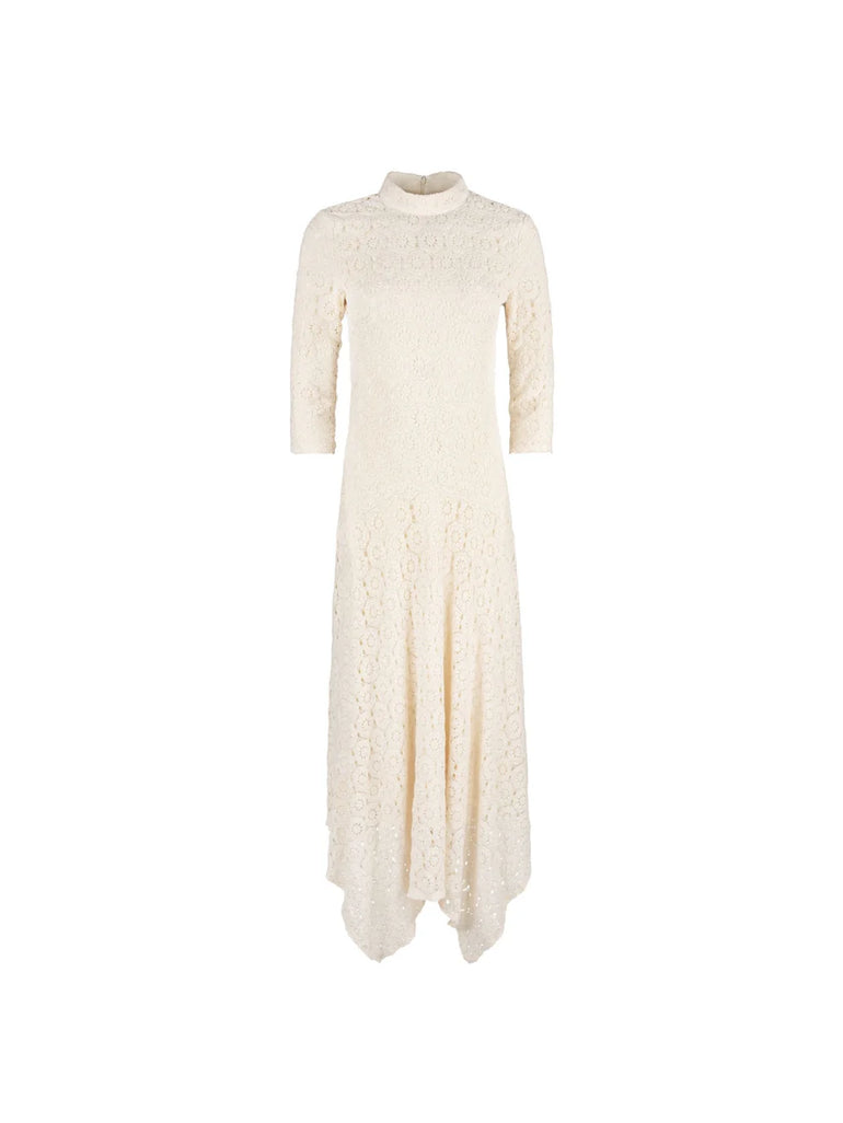 The Asymmetrical Crochet Lace Dress features intricate crochet lace and an elegant asymmetrical hem, combining classic style with modern detailing.