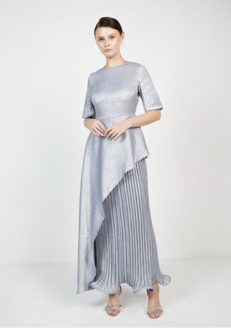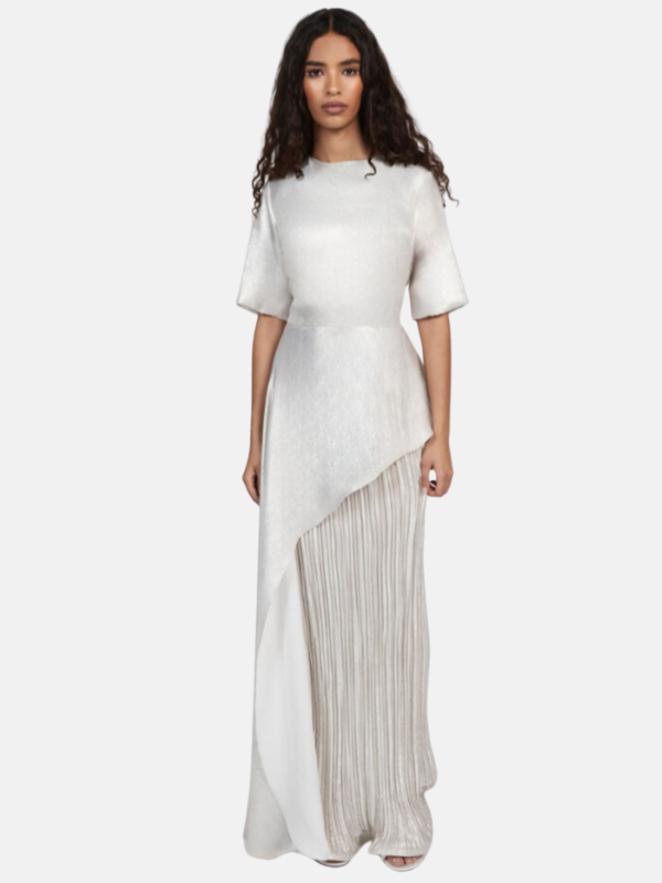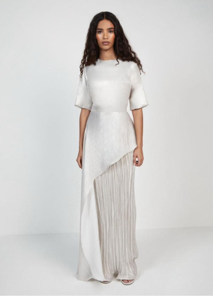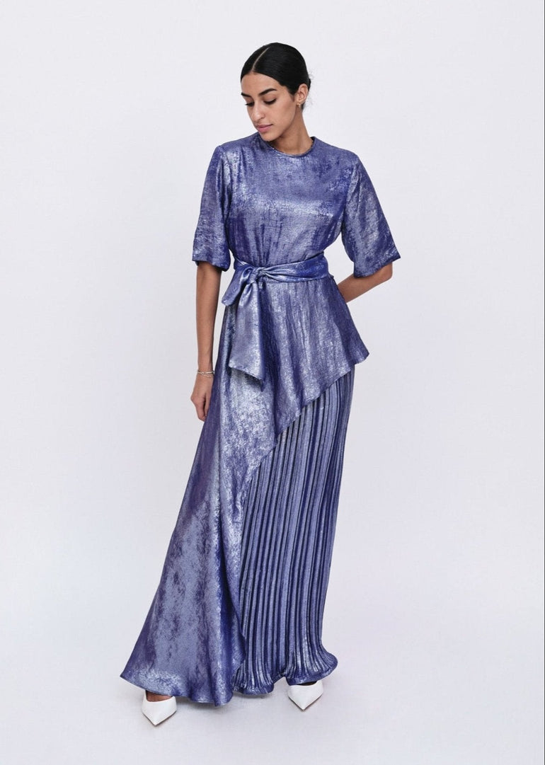 Asymmetric dress made of metallic-foil fabric. The dress is artfully layered below waistline with gathered metallic fabric for the inner layer.