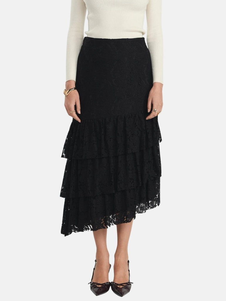 The Noir Asymmetrical Skirt is crafted from delicate lace fabric and designed with an uneven hemline that adds edge to its feminine silhouette. A timeless black hue makes it endlessly versatile.