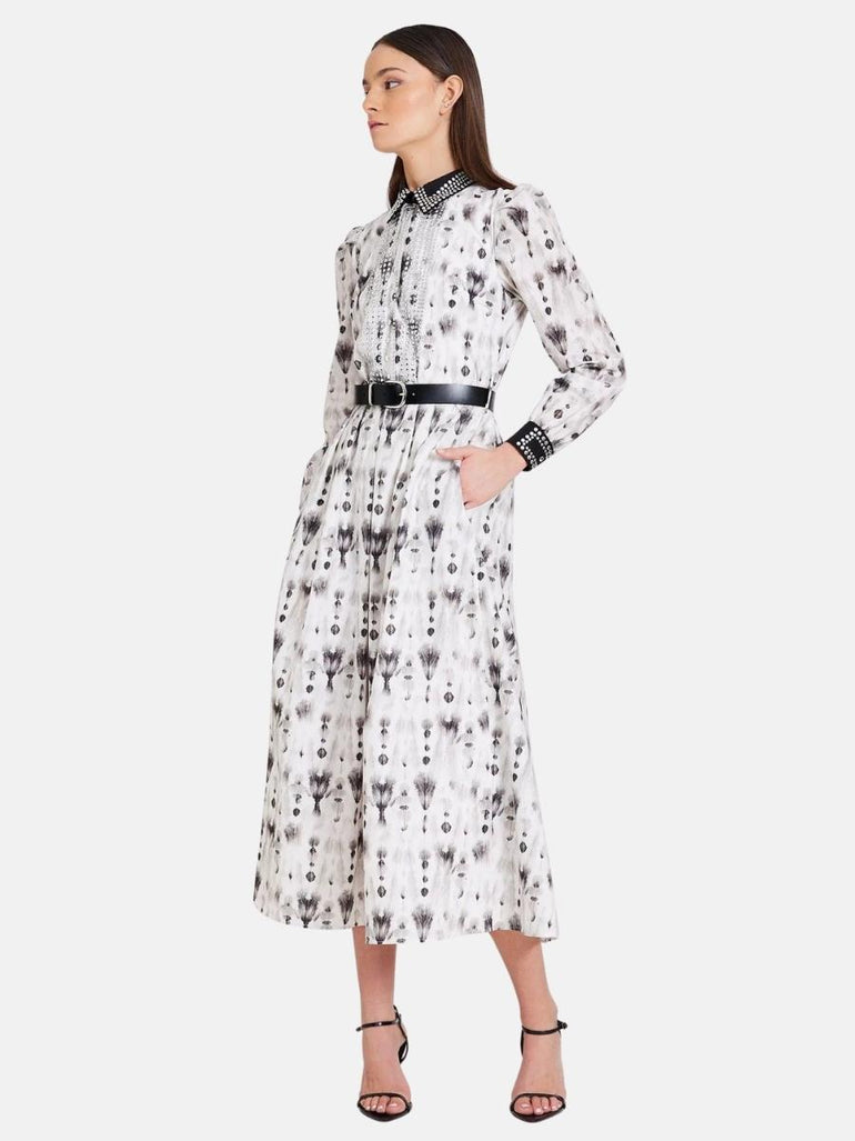 Edgy yet effortless, this black midi dress combines playful prints with subtle metal stud detailing for a modern twist on a classic silhouette. Crafted from breathable cotton, it offers comfort and structure, making it a versatile piece that transitions seamlessly from daytime outings to evening events.