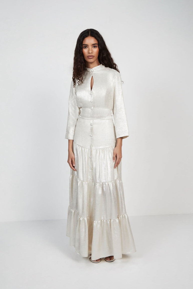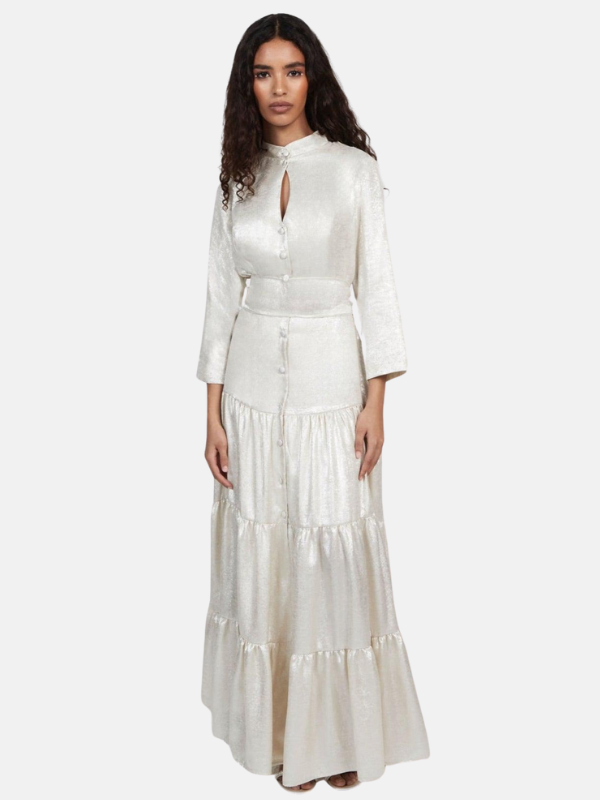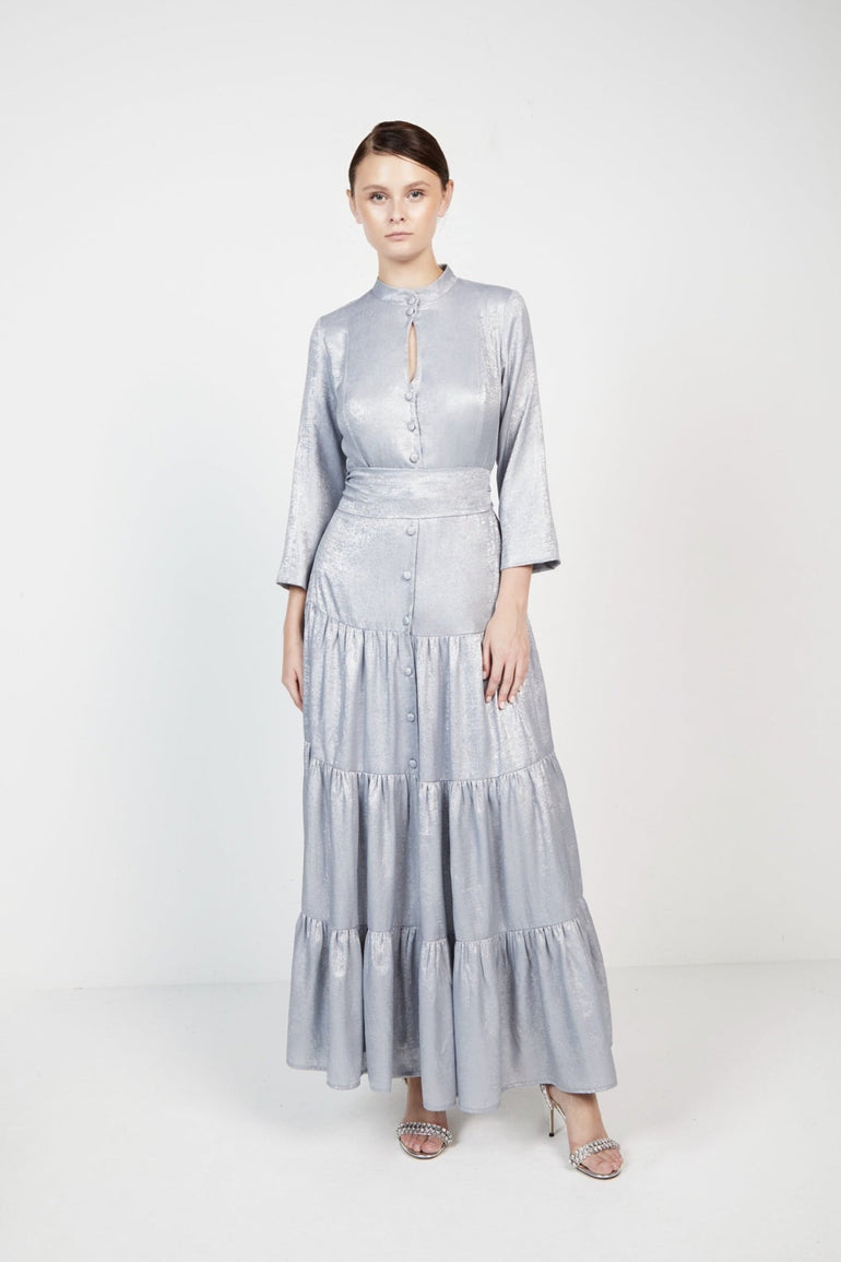Maxi shirt dress, features standing collar and key-hole details below neckline.