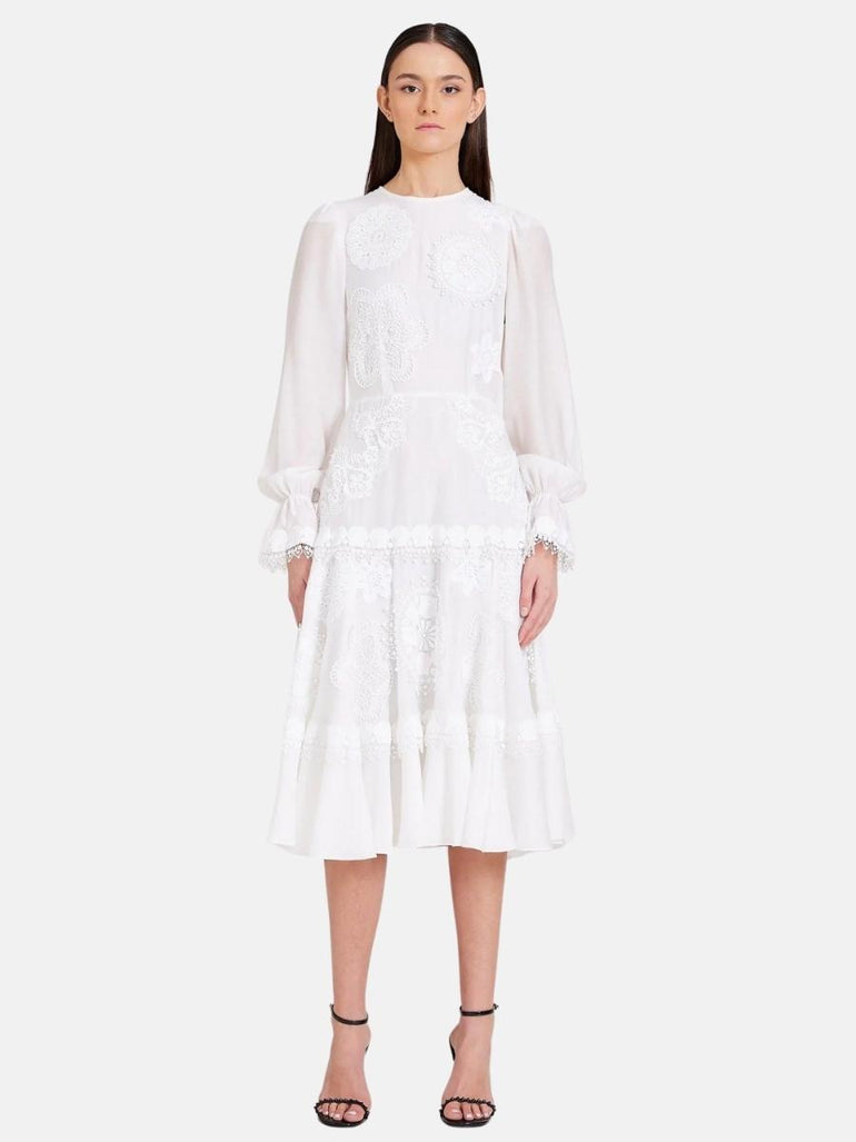 Delicate and romantic, this white midi dress combines soft floral appliqués with elegant lace ribbon details for a timelessly feminine look. Crafted from silk-like fabric, it drapes gracefully while adding texture and dimension with every step. Perfect for special occasions or elevated daytime events, it’s a standout piece that exudes effortless elegance.