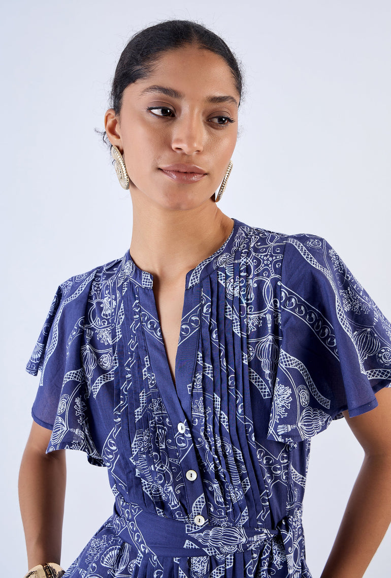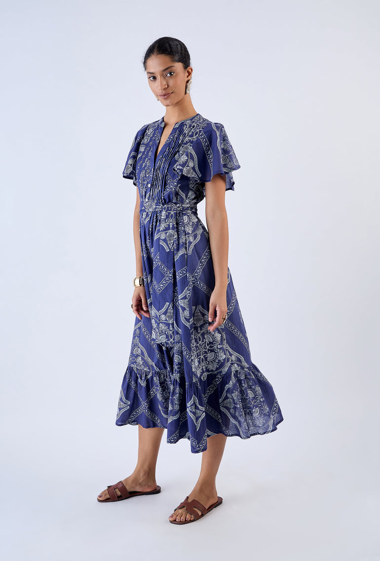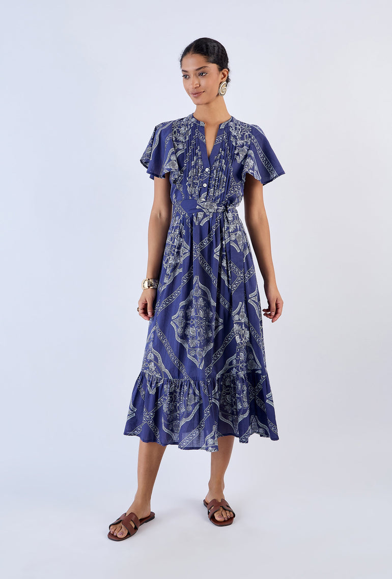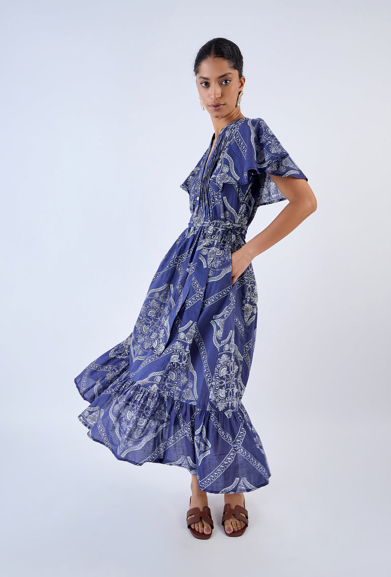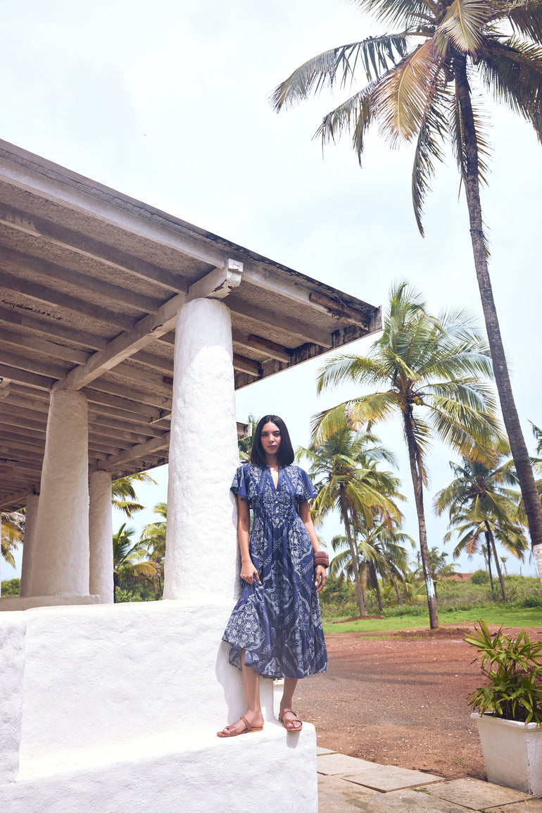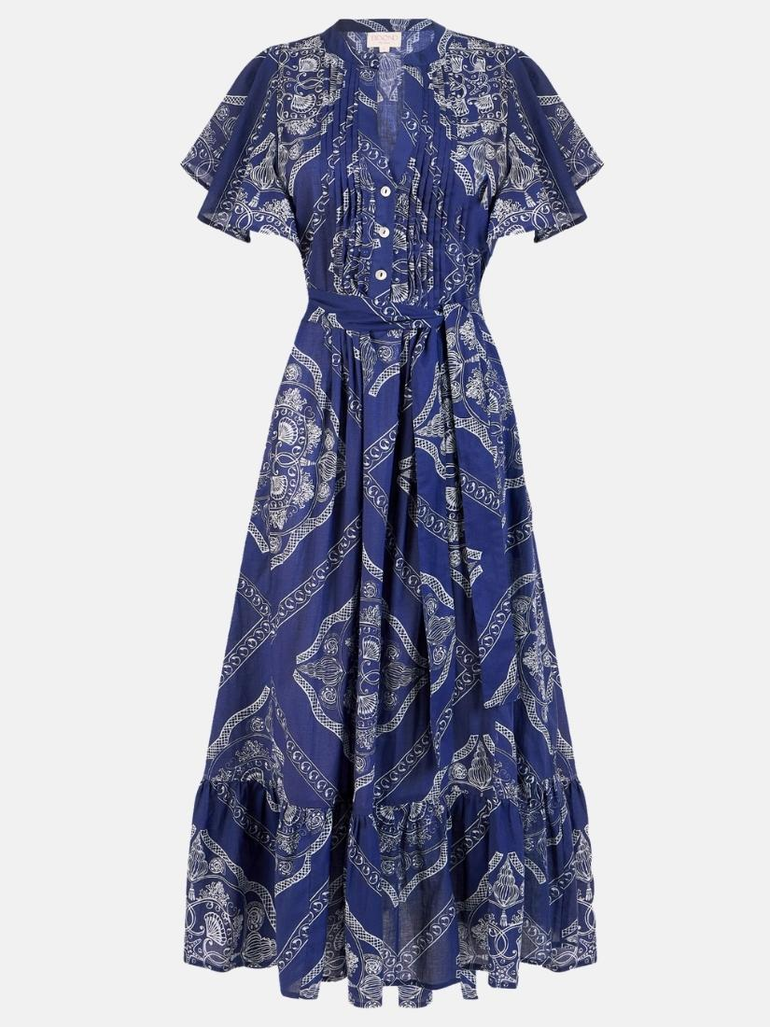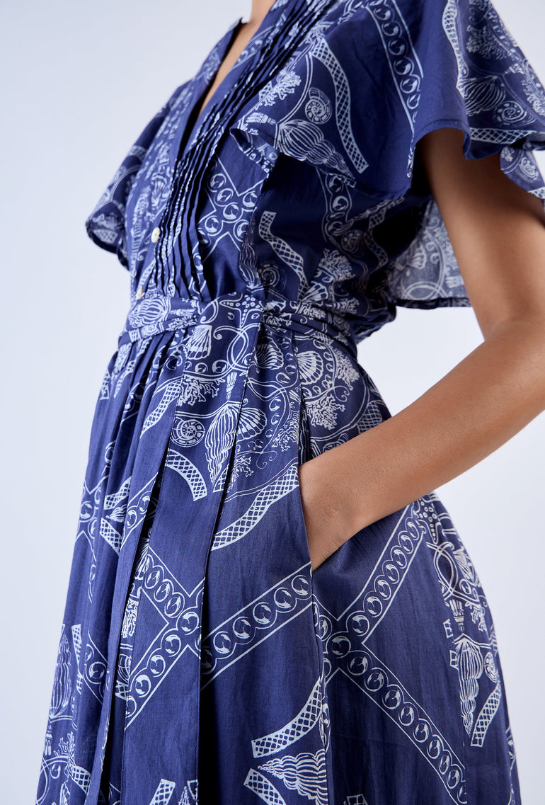 The Leni dress is a true ode to femininity. The universally flattering loose cut is accentuat- ed by subtle pleats and a ruffled hem, while the featured belt cinches in at the waist for a truly enchanting silhouette. Leni is made from a soft, breathable cotton cambric fabric. The print design ‘Sea Bounty’ captures the essence of an abundant harvest caught in a fisherman's net. Delicate shells, shimmering fish, and other marine treasures dance across the fabric.