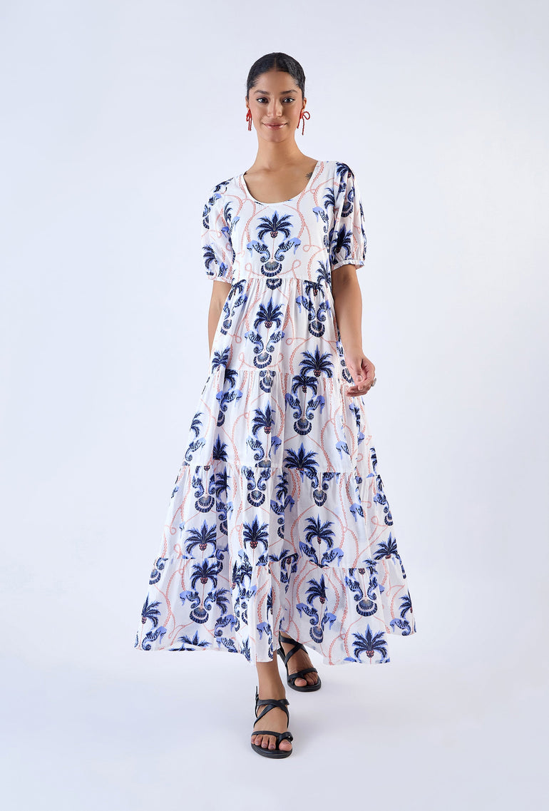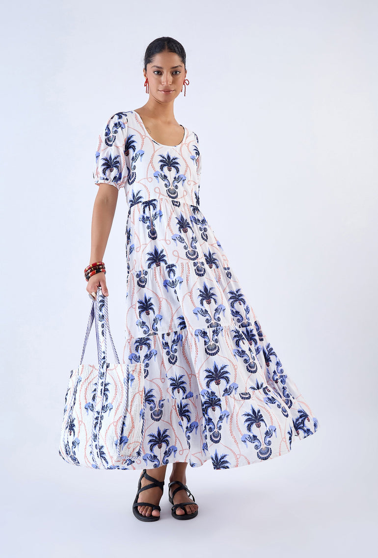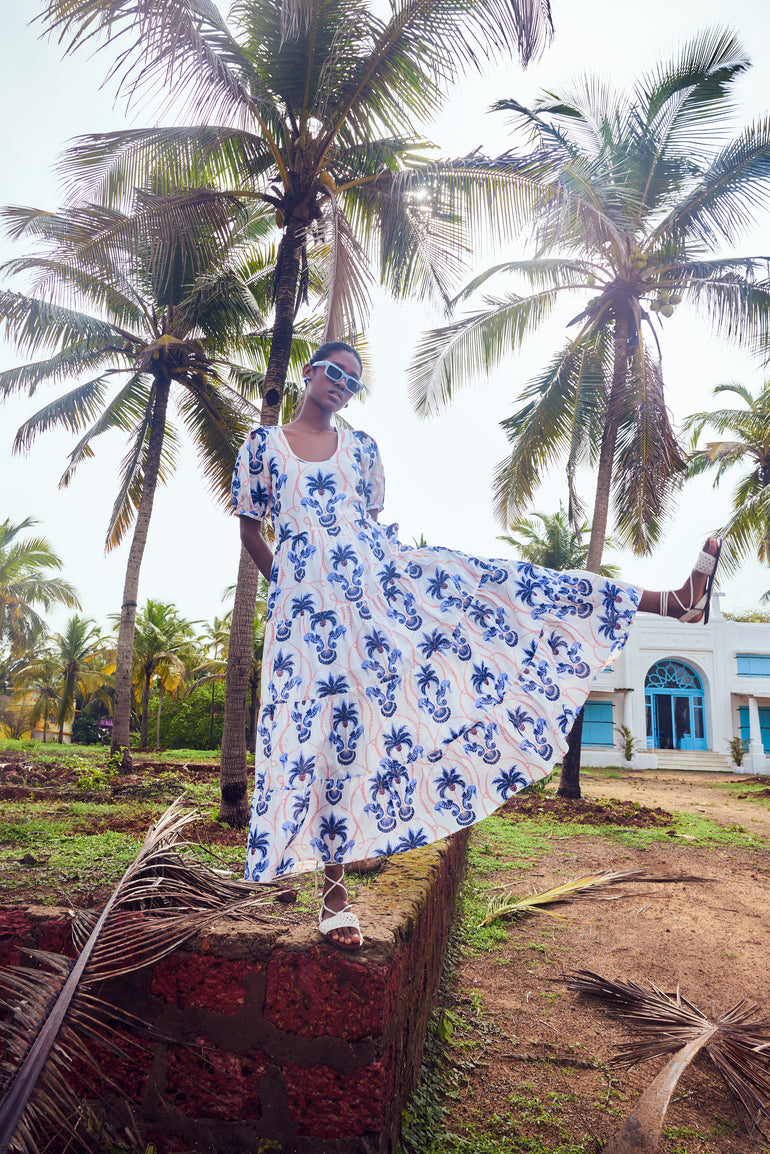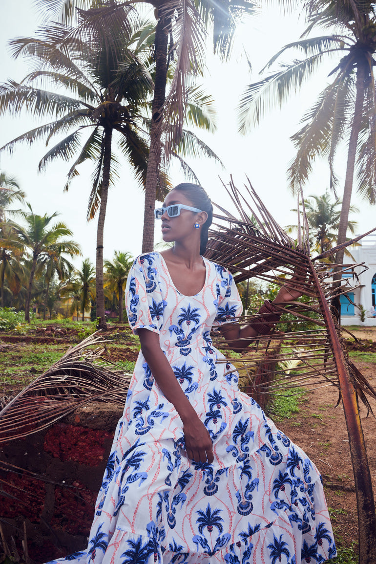 Elevate your look with the Daisy dress, a contemporary choice for your everyday wardrobe. Featuring a round neckline, puff sleeves and relaxed fit, the maxi offers both comfort and style. Complete the look and cinch in the waist with the included braided belt adorned with real shells. Daisy is made from a soft, breathable cotton cambric fabric. Inspired by the adventure of sailing to a secluded island, ‘Paradise Island’ references the pristine beauty of an untouched shore.
