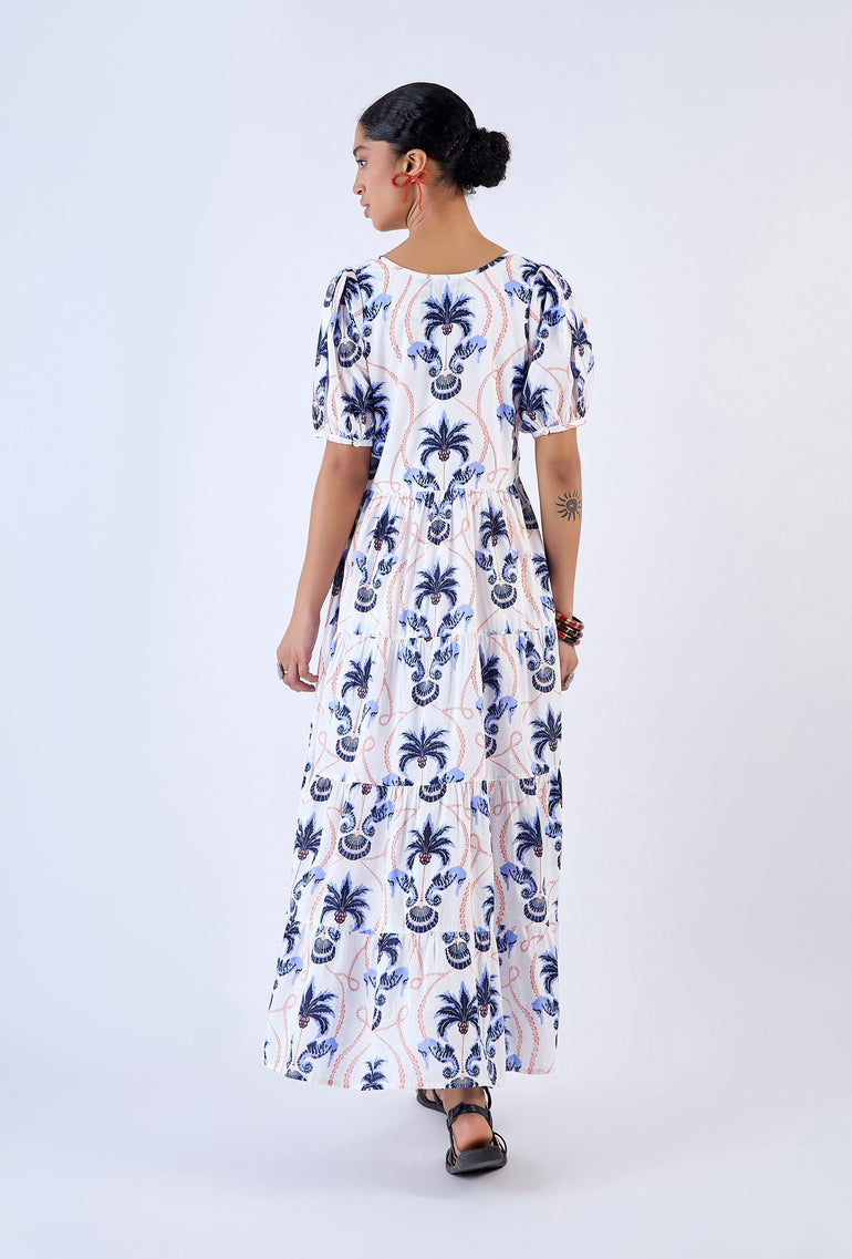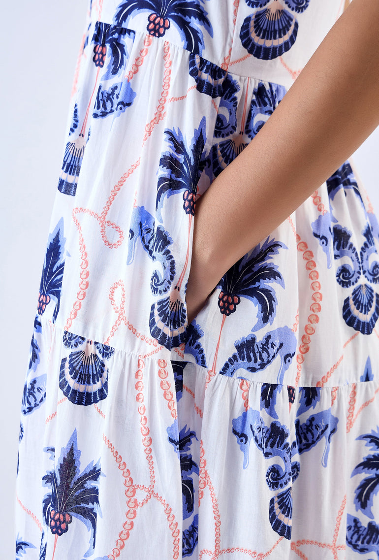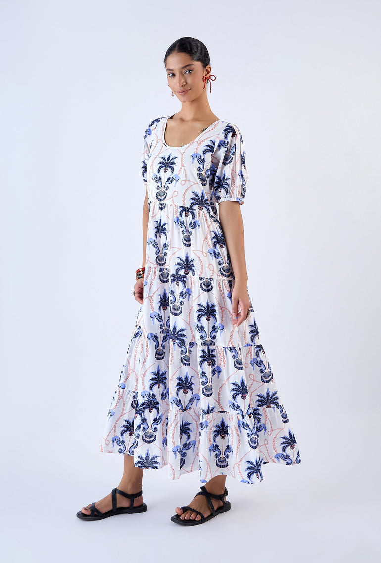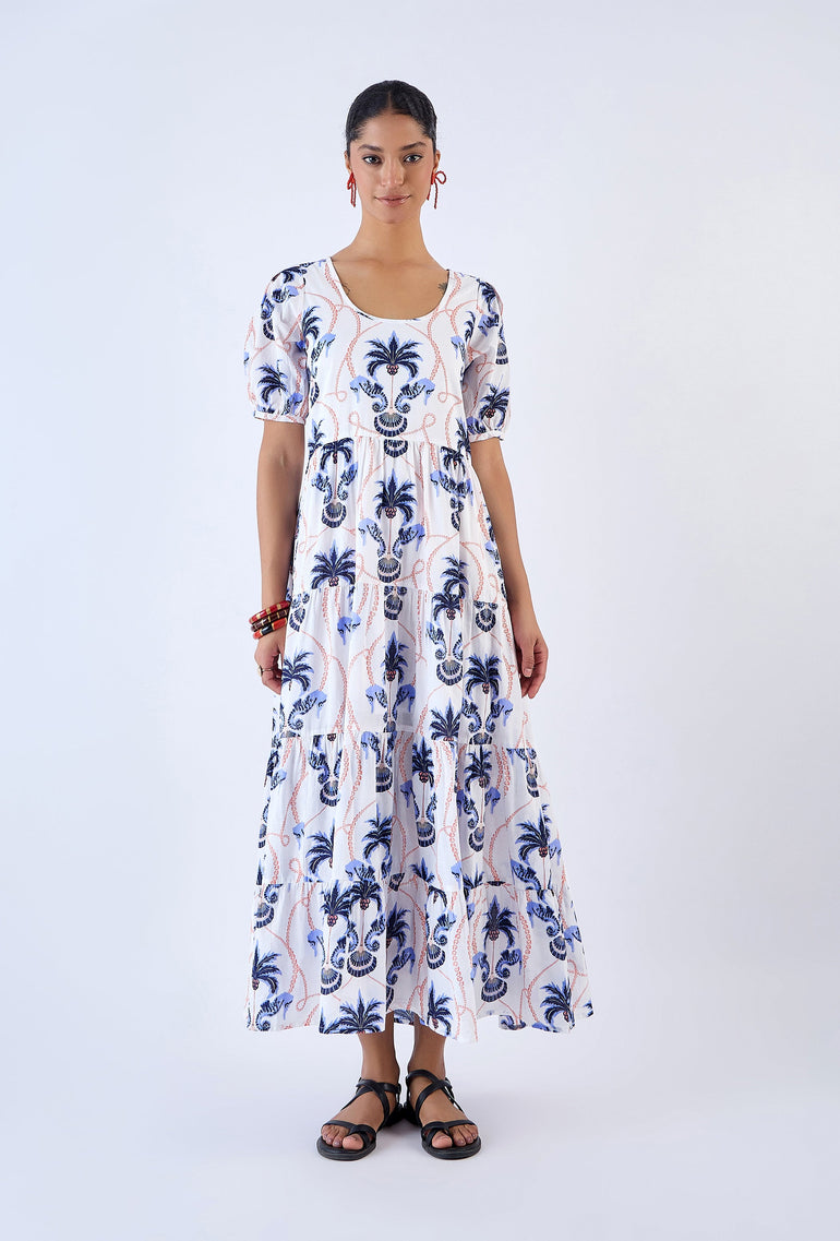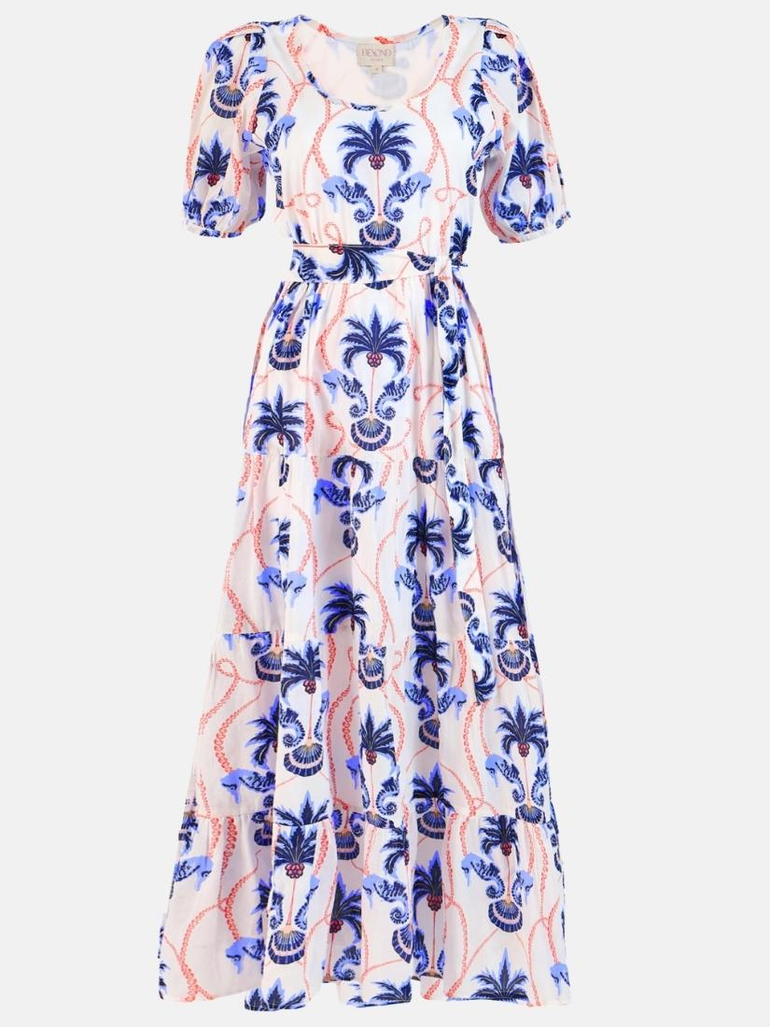 Elevate your look with the Daisy dress, a contemporary choice for your everyday wardrobe. Featuring a round neckline, puff sleeves and relaxed fit, the maxi offers both comfort and style. Complete the look and cinch in the waist with the included braided belt adorned with real shells. Daisy is made from a soft, breathable cotton cambric fabric. Inspired by the adventure of sailing to a secluded island, ‘Paradise Island’ references the pristine beauty of an untouched shore.