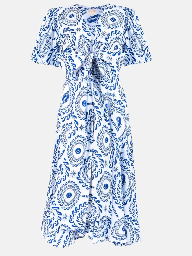 Lola is our signature style and all-time favorite. Crafted from 8 meters of softest, breathable cotton, the Lola is made to twirl in and spread joy! She is chic, easy-to-wear and incredibly versatile: Tie her in the front (with a bow) for an enticing, deep V-neckline or in the back for a bit more coverage. Set sail on a nautical adventure with our latest print ‘Sail away’, inspired by the exhilarating experience of being at sea. Featuring nautical motifs like lighthouses, waves, and anchors, this design captures the essence of a life at sea.