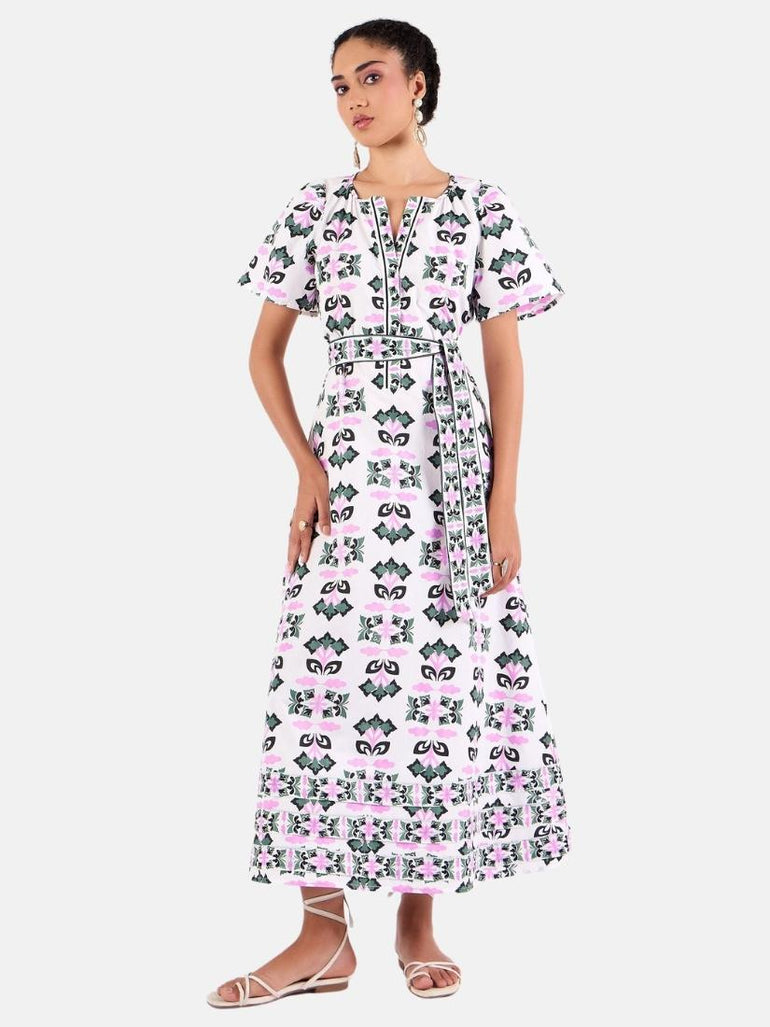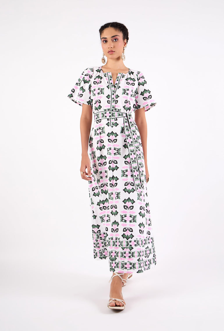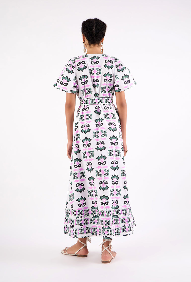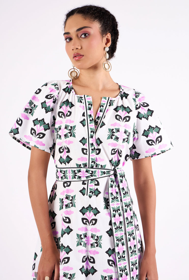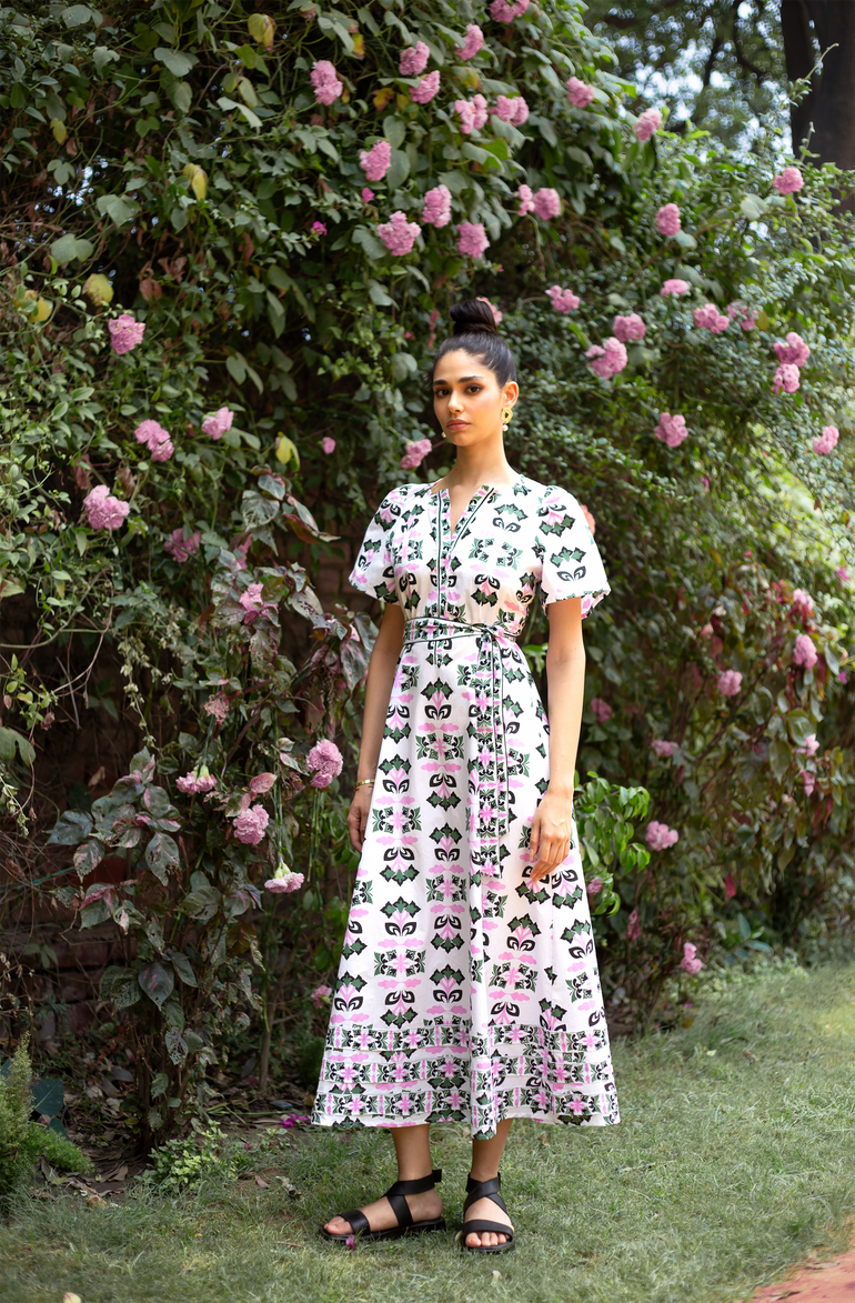 Meet Suzi, a versatile new silhouette designed to flatter all body types. The pullover midi dress boasts an adjustable V-neckline, semi-puff, straight sleeves and A-line skirt with pin-tucked details. The relaxed waist can be cinched with the included belt, making it an ideal dress to elevate your everyday style. Suzi is crafted from breathable premium Cotton Poplin. Taking cues from the spectacular butterflies native to the Pyrenees, this design uses simple flower and butterfly motifs to create a captivating geometric pattern.
