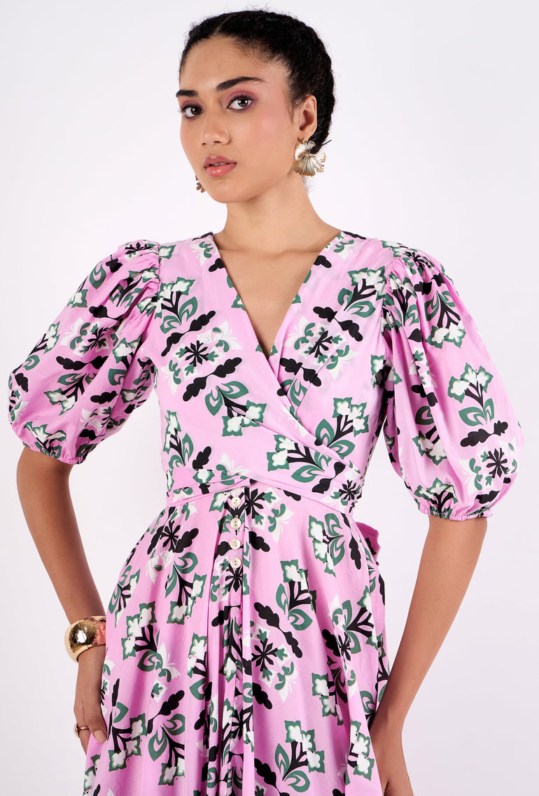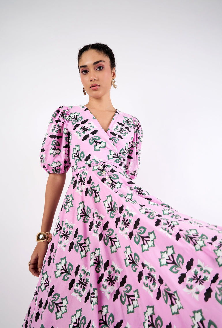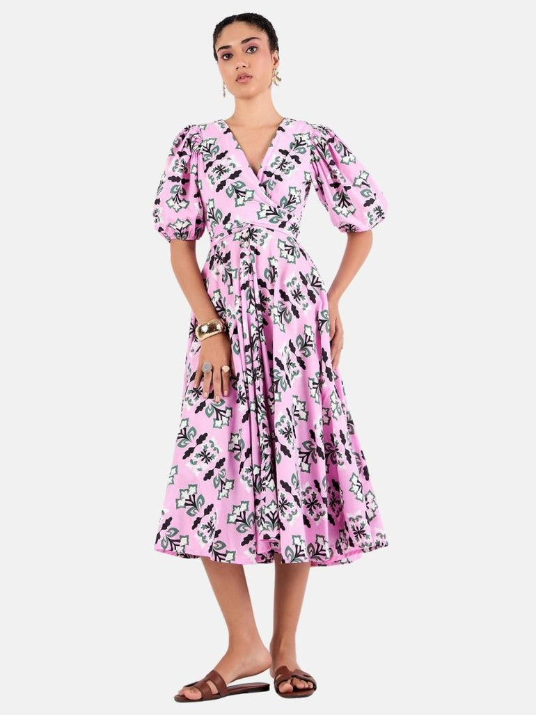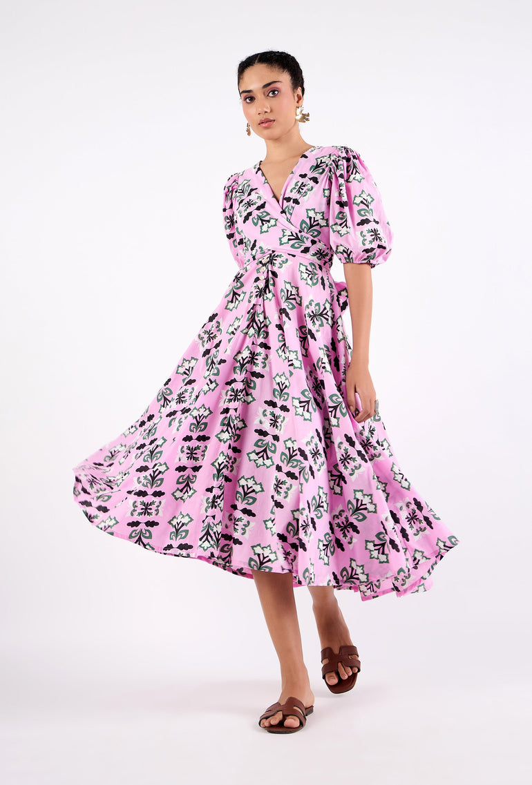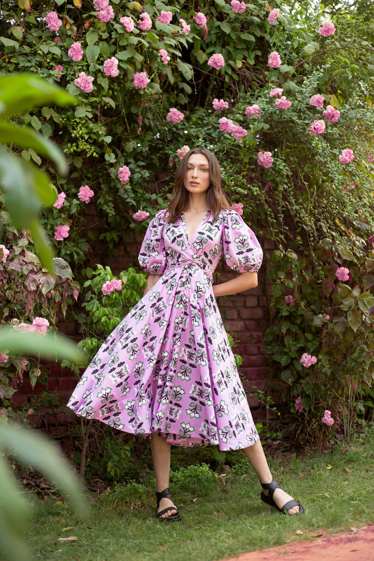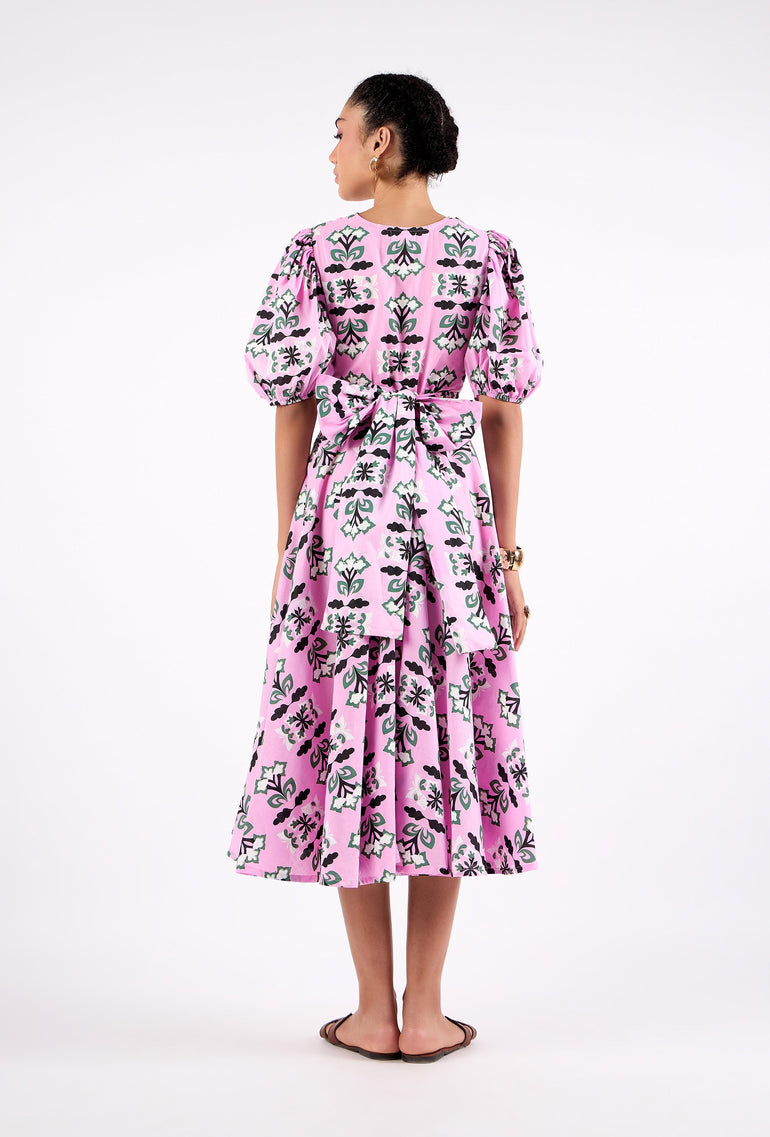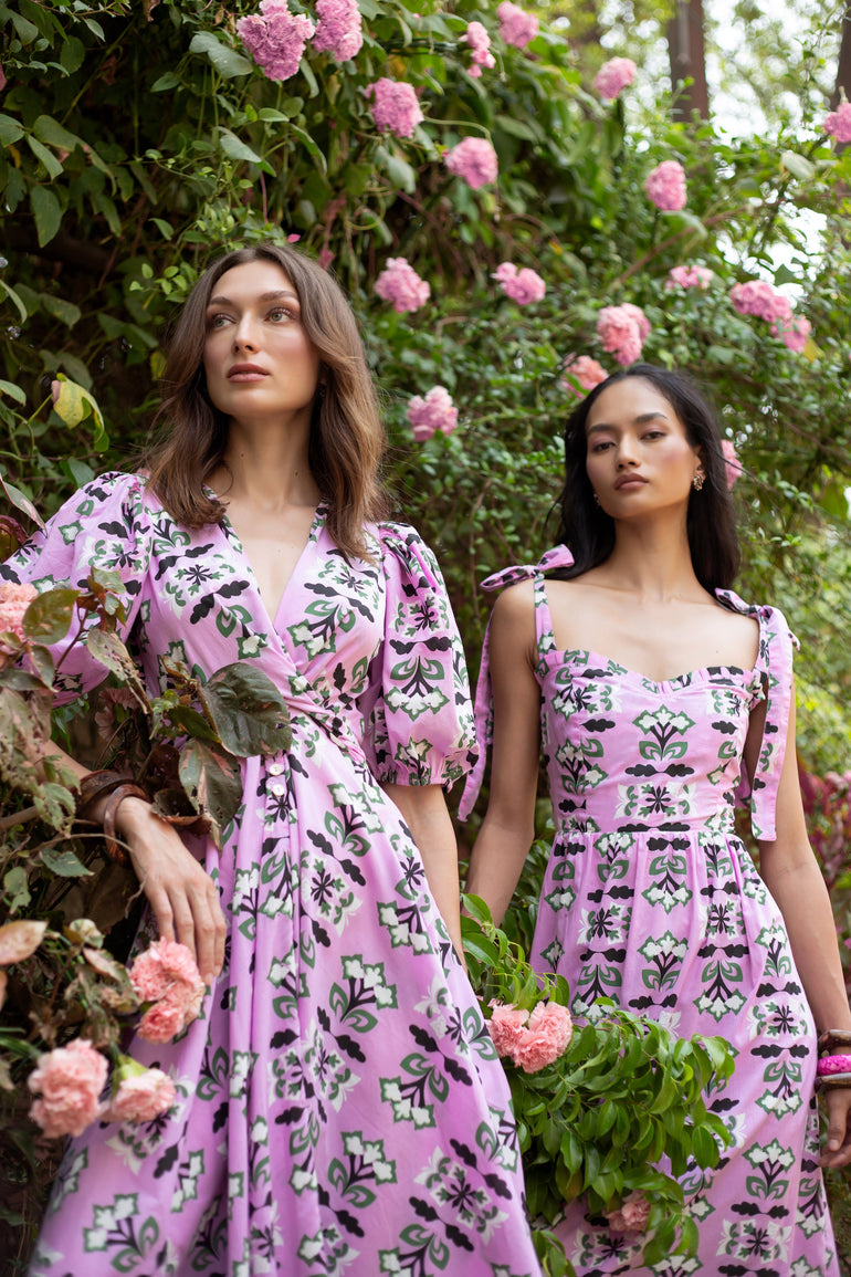 Lola is our signature style and all-time favorite. Crafted from 8 meters of softest, breathable cotton, the Lola is made to twirl in and spread joy! She is chic, easy-to-wear and incredibly versatile: Tie her in the front (with a bow) for an enticing, deep V-neckline or in the back for a bit more coverage. Taking cues from the spectacular butterflies native to the Pyrenees, this design uses simple flower and butterfly motifs to create a captivating geometric pattern.