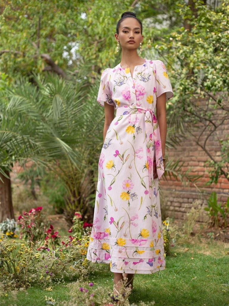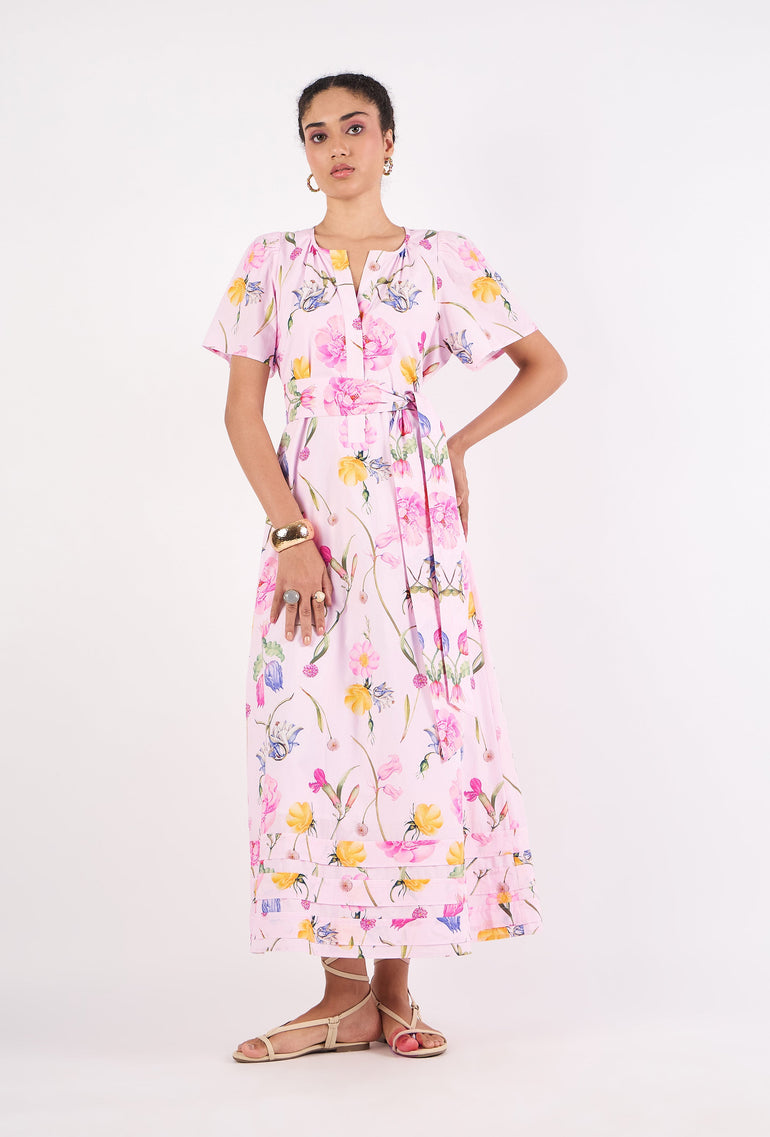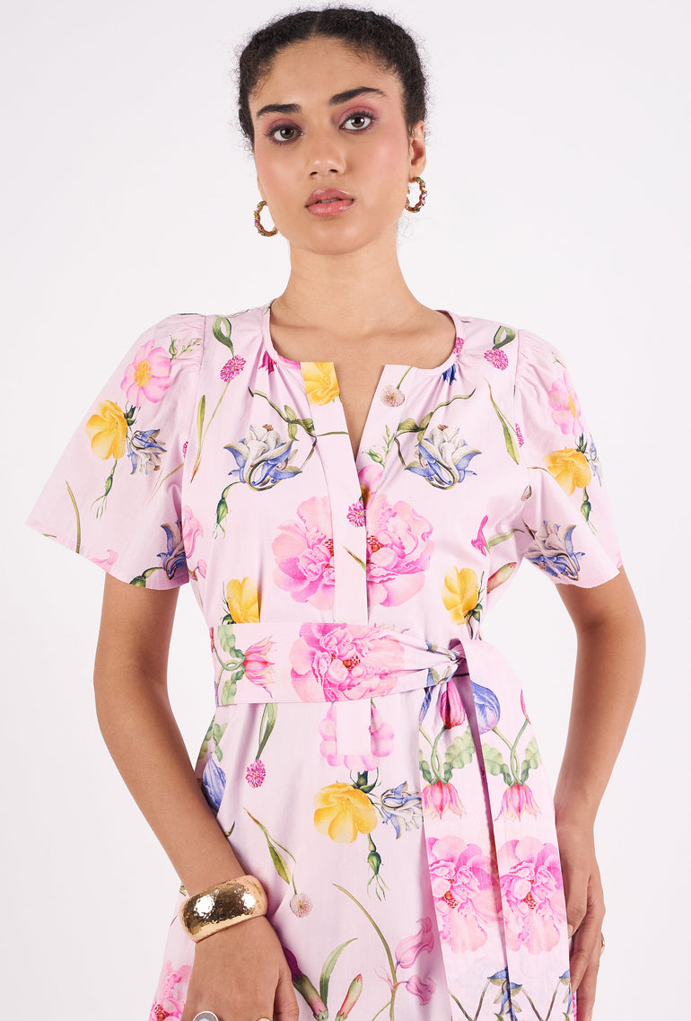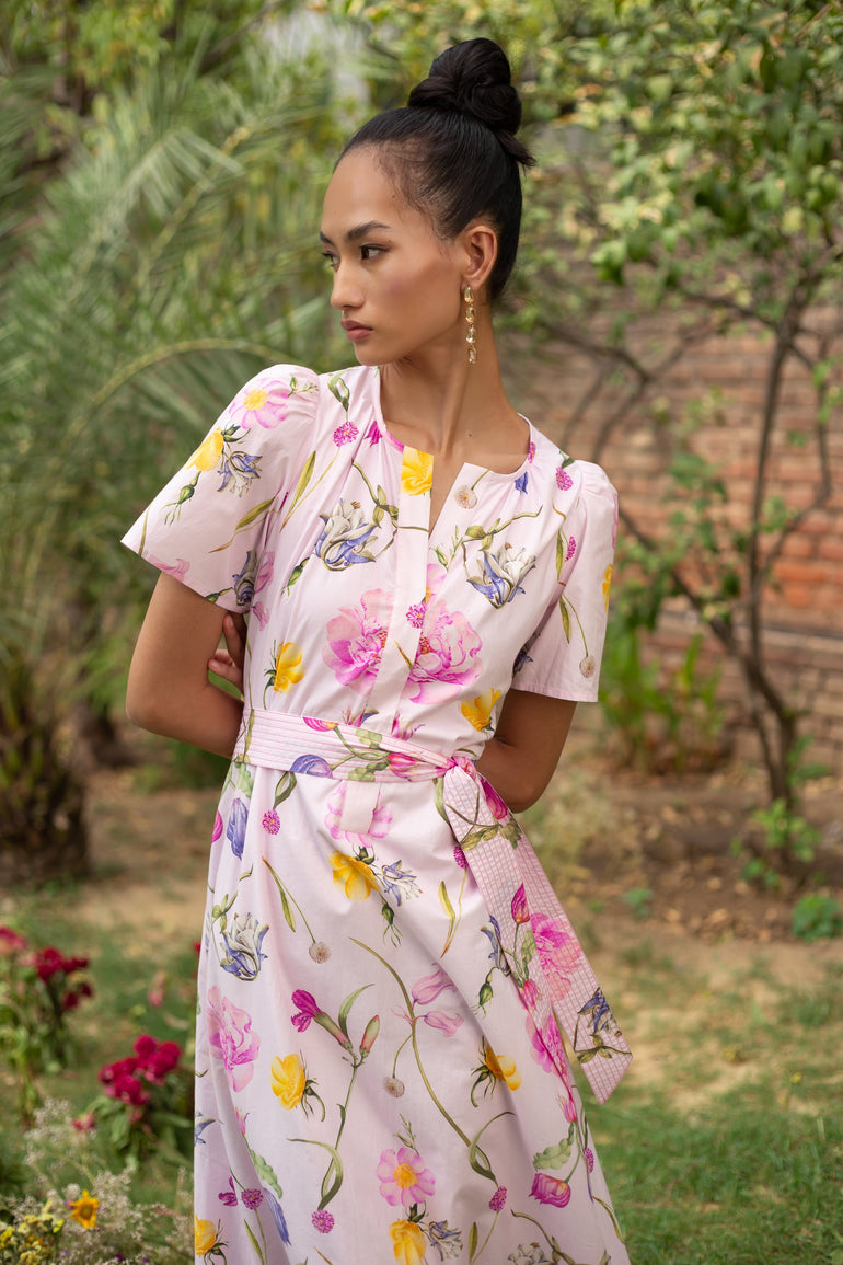 Meet Suzi, a versatile new silhouette designed to flatter all body types. The pullover midi dress boasts an adjustable V-neckline, semi-puff, straight sleeves and A-line skirt with pin-tucked details. The relaxed waist can be cinched with the included belt, making it an ideal dress to elevate your everyday style. Suzi is crafted from breathable premium Cotton Poplin. Drawing inspiration from the traditional perfume-making craft in Provence, this print evokes the magic of turning jasmine, iris and roses into an alluring fragrance.