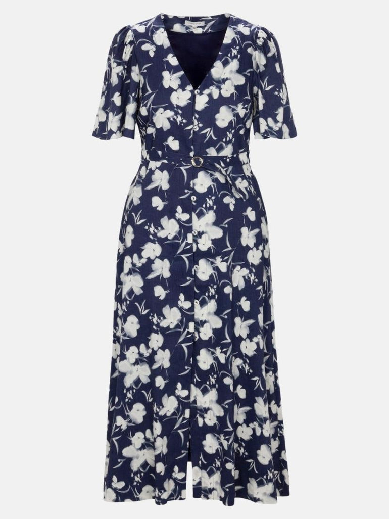 A refined linen-blend midi dress featuring covered button closures, a flattering self-belt detail, and a fully lined finish. Lightweight yet structured, it’s an effortlessly polished piece for any warm-weather occasion.