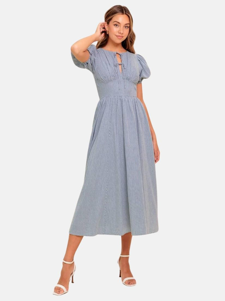 A striped woven midi dress featuring round neckline, front bow ties, short puff sleeve, waist yoke, full skirt and back zipper closure.