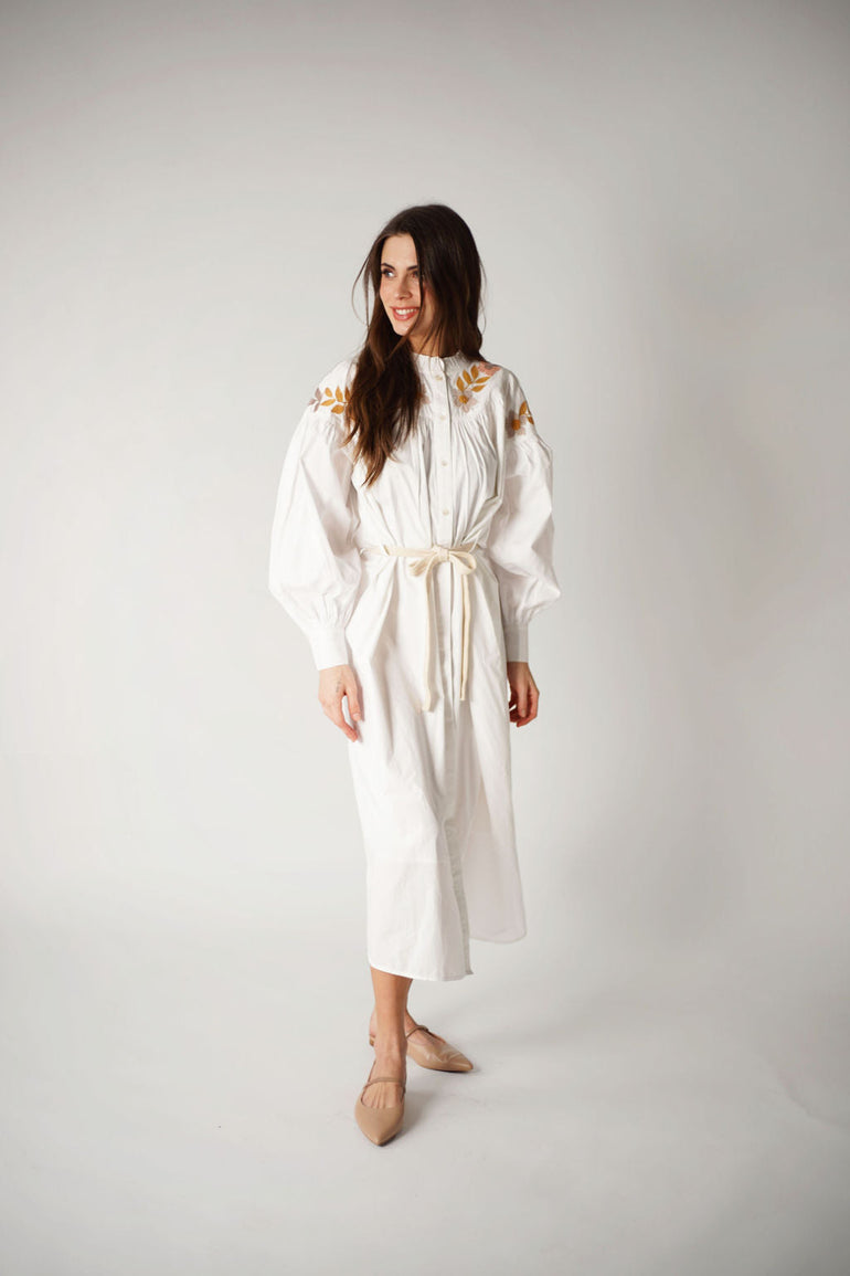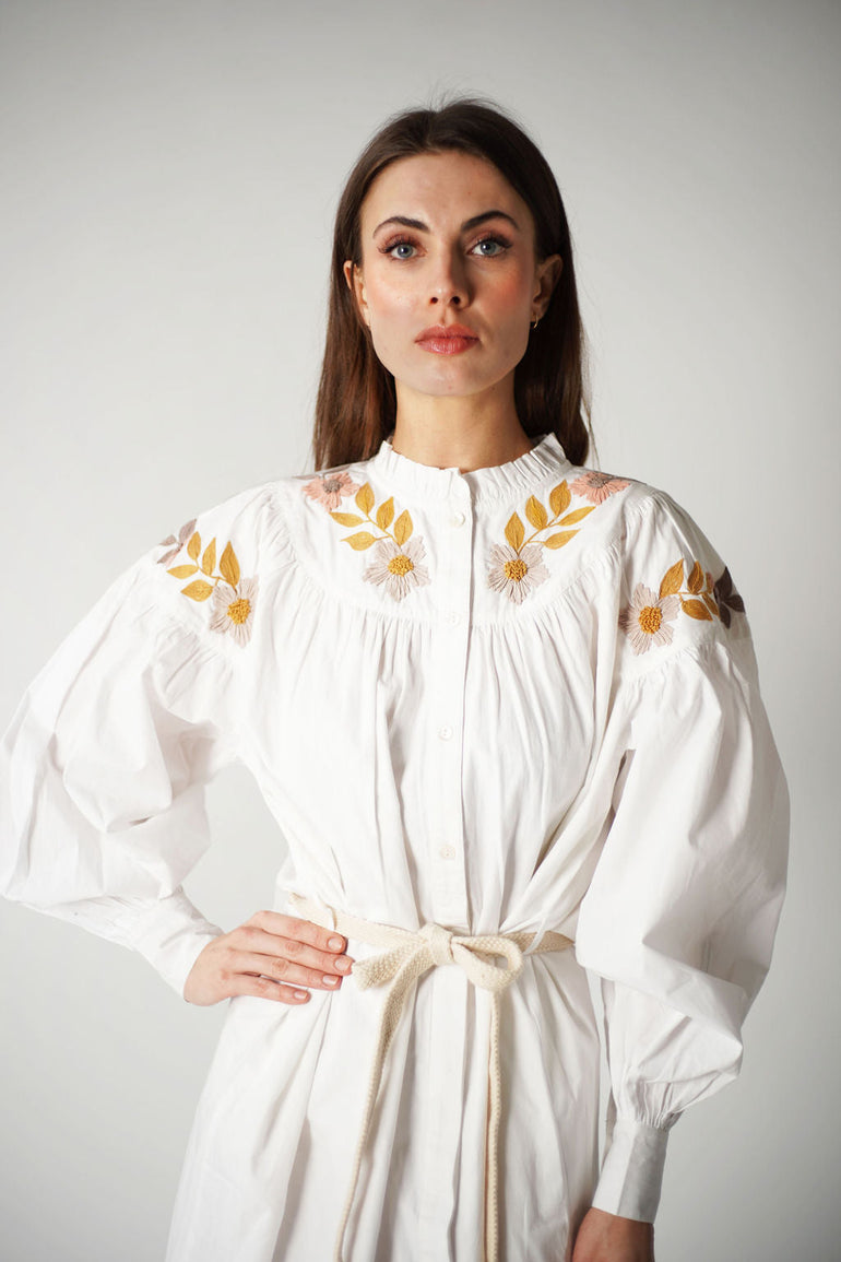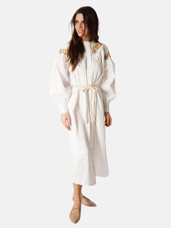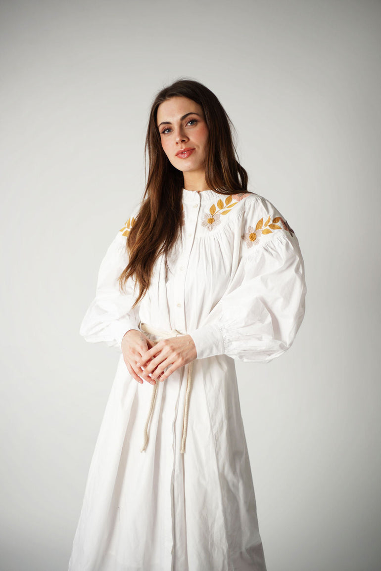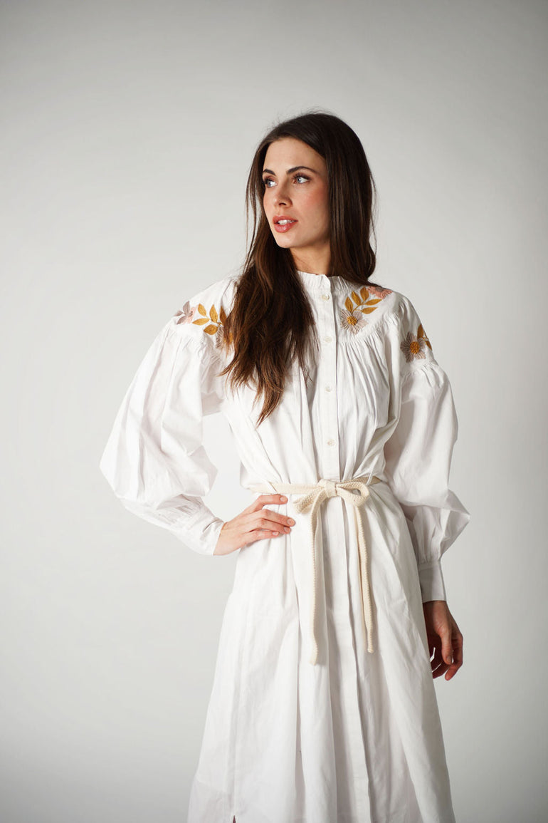 This beautiful white dress is made from thick, non-sheer fabric for full coverage and comfort. Hand-stitched neutral floral embroidery decorates the top, adding a timeless touch. The rope belt cinches the waist for a flattering perfect for effortless, refined style.