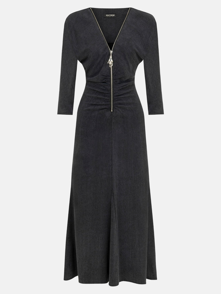 Make a statement with every step in this breathtaking Nocturne dress, featuring a draped design complemented by a gracefully front zipper design. Its slim fit, full mold, unlined, front zipper design, lack of pockets, three-quarter sleeves, and draped, detailed long dress contribute to its overall aesthetic appeal.