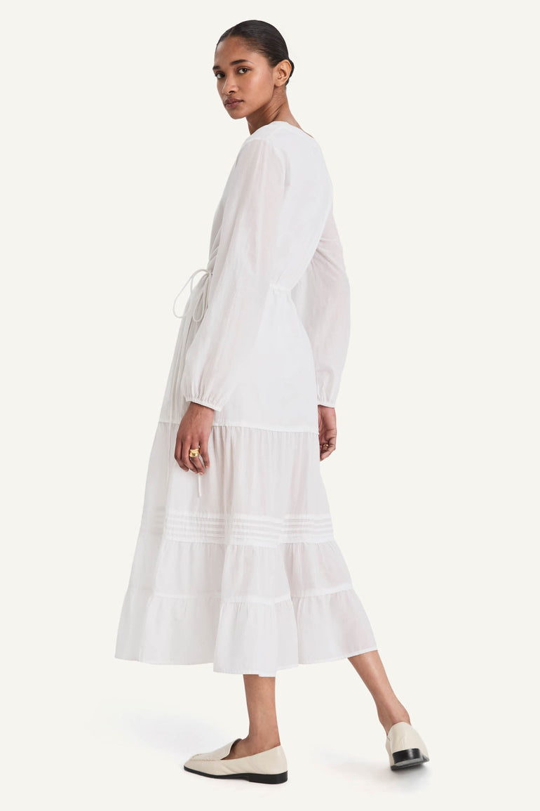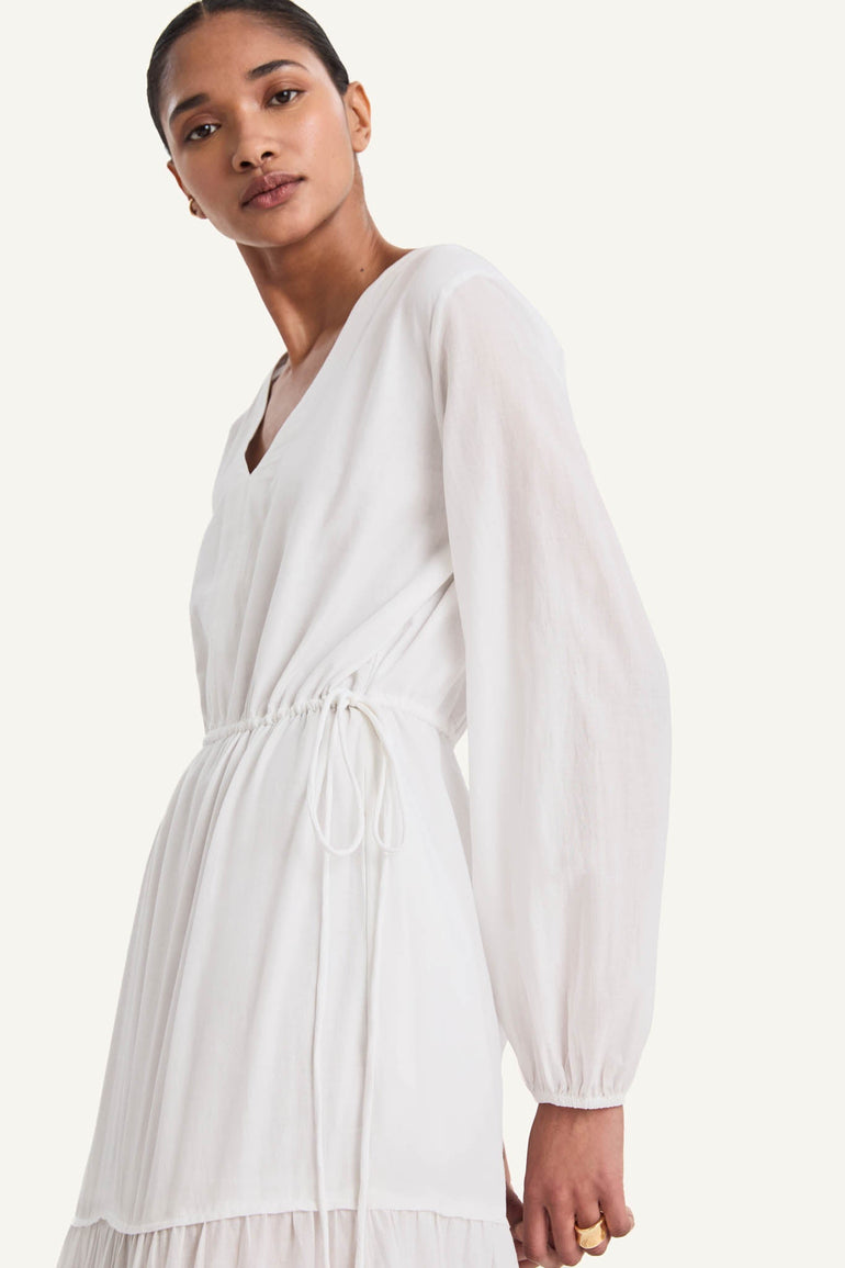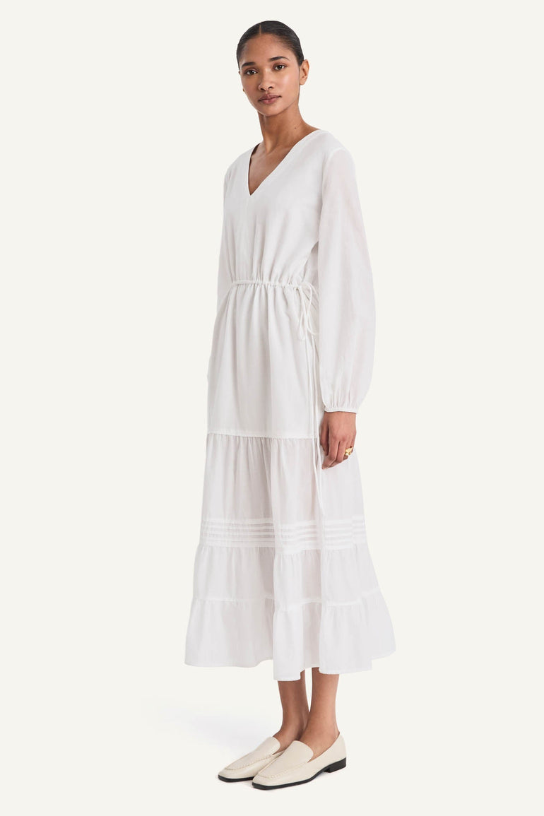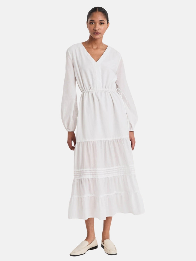 Embrace effortless elegance with the EZE Dress. Crafted from 100% cotton voile, this ankle-length style features gathered pintuck tiers create a romantic, tiered silhouette, while a v-neckline and leg slit offer a subtly alluring quality. Long sleeves with elastic cuffs and an adjustable drawcord waist provide a customizable fit, and side pockets add a practical touch. Fully lined for coverage, this dress epitomizes relaxed sophistication—simply push up the sleeves and go for a more casual look.