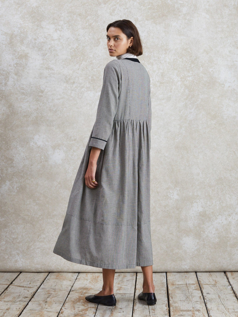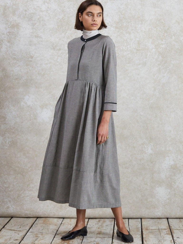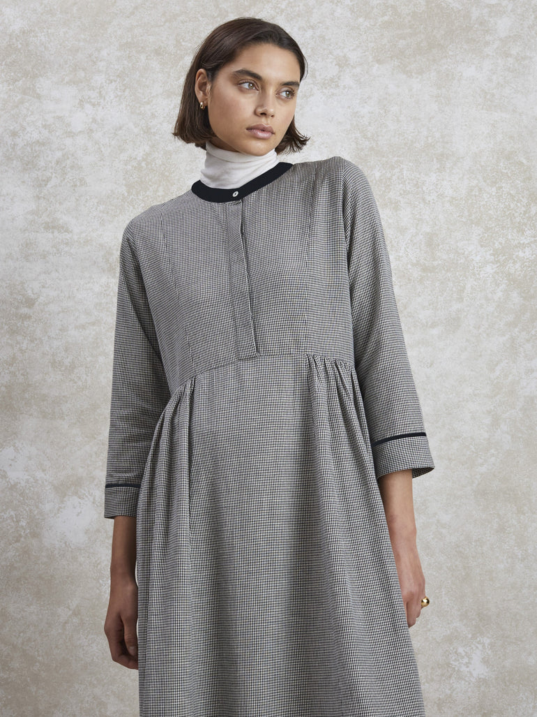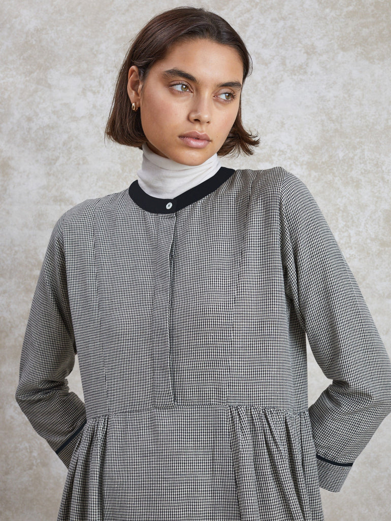Meet your new favourite day dress. Fleur is cut from monochrome, checked woven cotton for a relaxed fit, with a collarless neckline, graduated empire waistline, and loose, cropped sleeves. No detail is left to chance; see the concealed placket, velvet trim and deep hem. Layer it over a roll neck and add ballet flats, or wear it with a gilet and chunky boots – it makes for versatile styling.