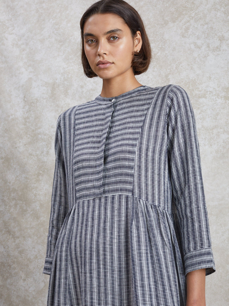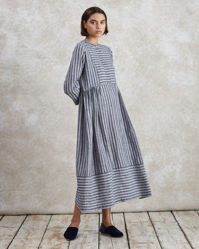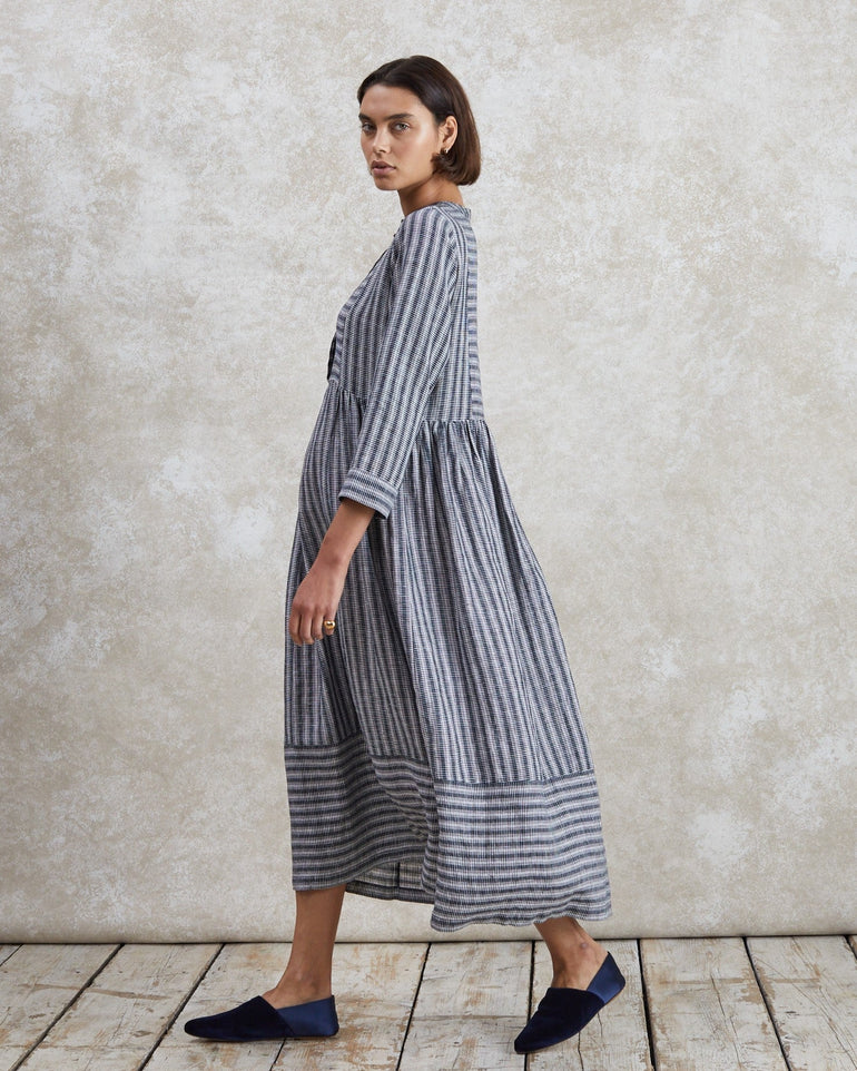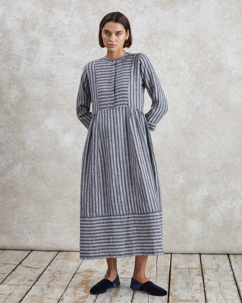Meet your new favourite day dress. Fleur is cut from striped, woven linen for a relaxed fit, with a collarless neckline, graduated empire waistline, and loose, cropped sleeves. No detail is left to chance; see the concealed placket, pleat detailing and deep hem. Layer it over a roll neck and add ballet flats, or wear it with a gilet and chunky boots – it makes for versatile styling.