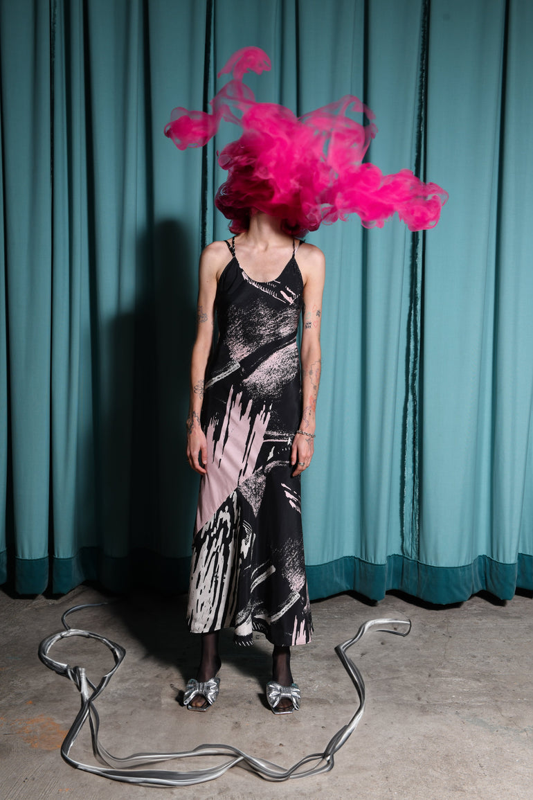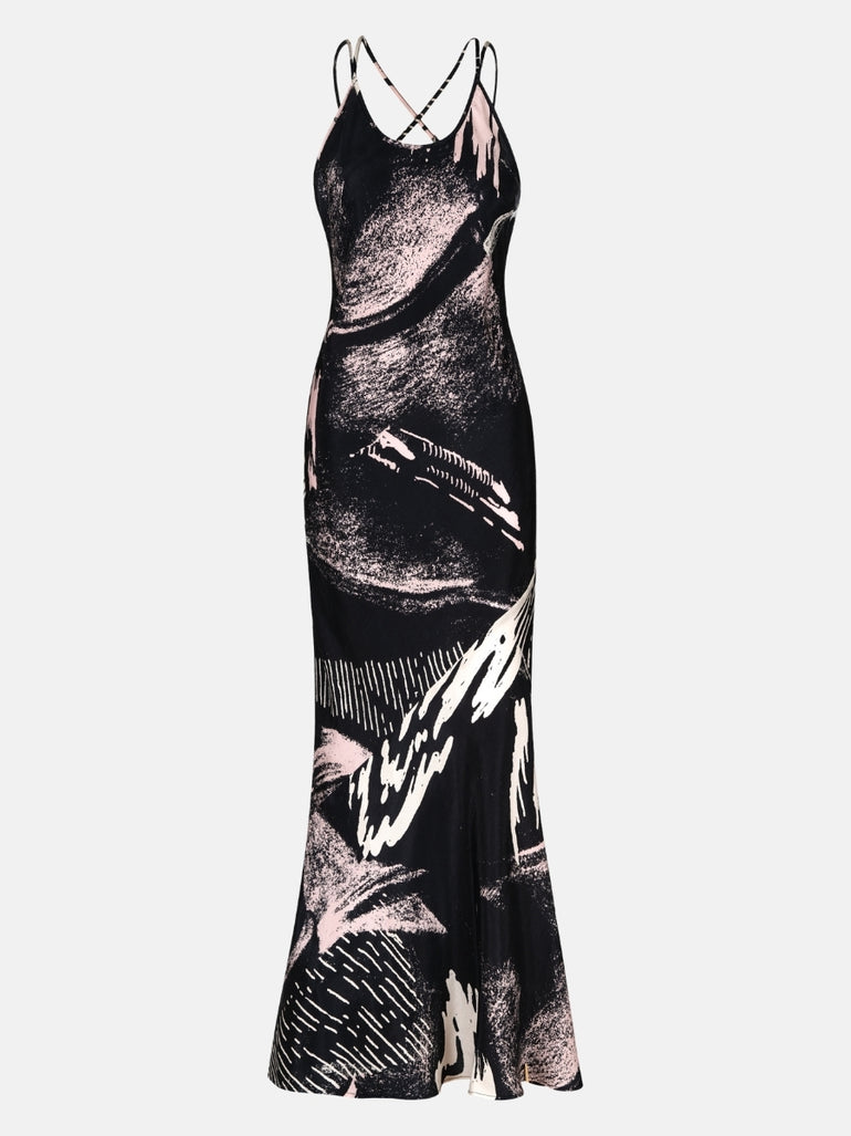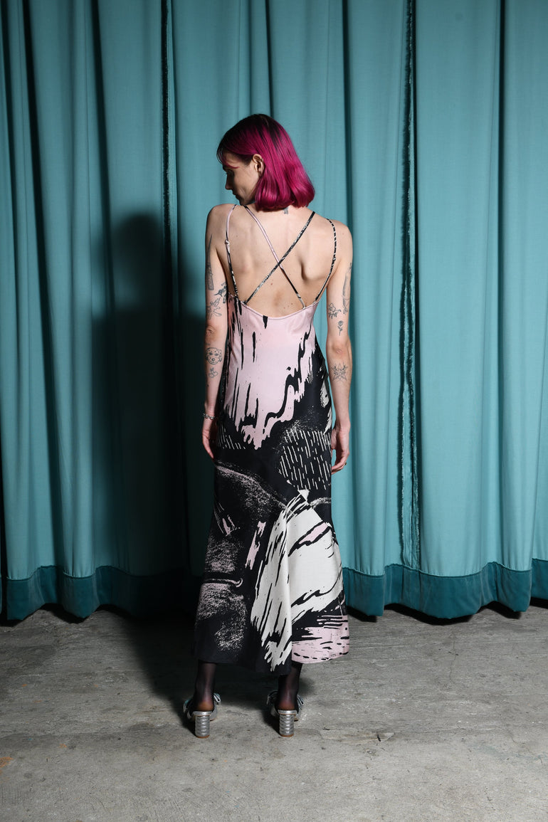 The Hellena dress is an elegant scoop neck silhouette crafted from certified washed TENCEL™ with silky twill finish. Featuring UIM custom hand painted abstract artwork Andromeda. Cut on bias, this body is a beautiful figure-skimming fit with crossover adjustable straps across the back and an asymmetrical hem.