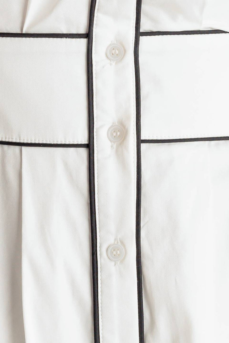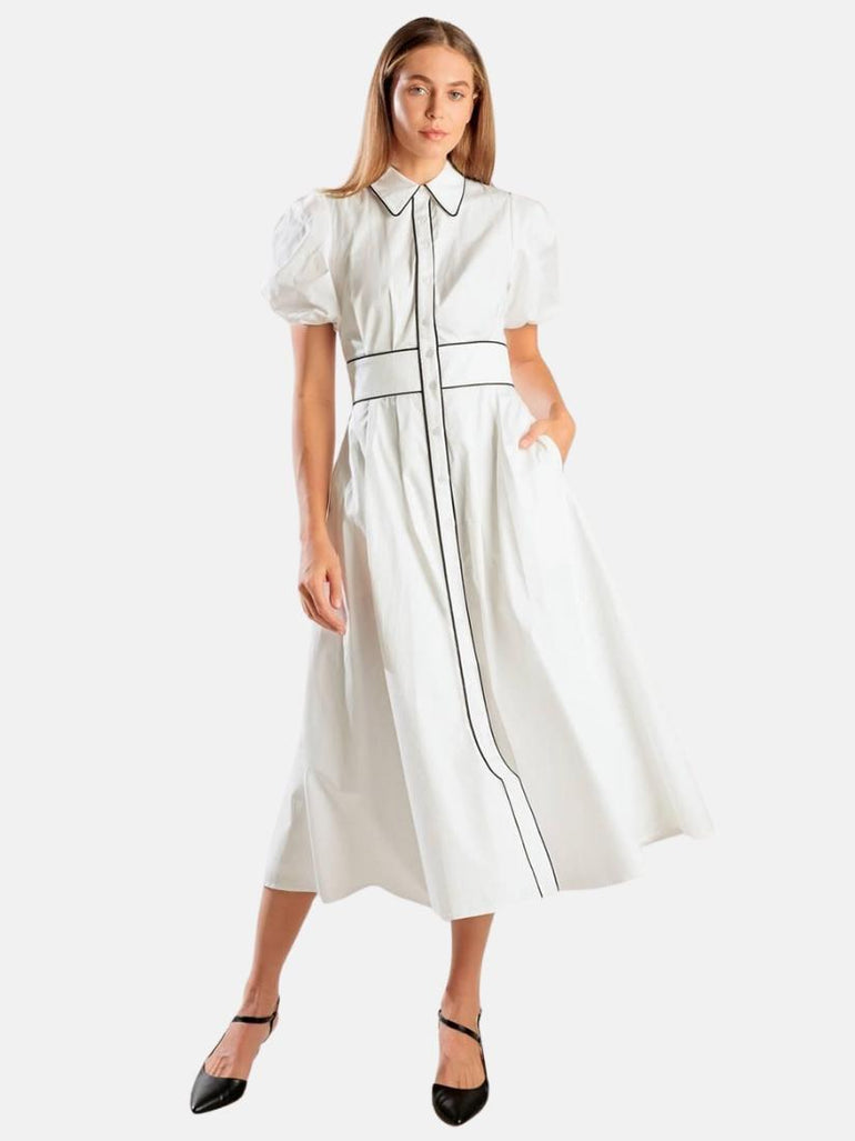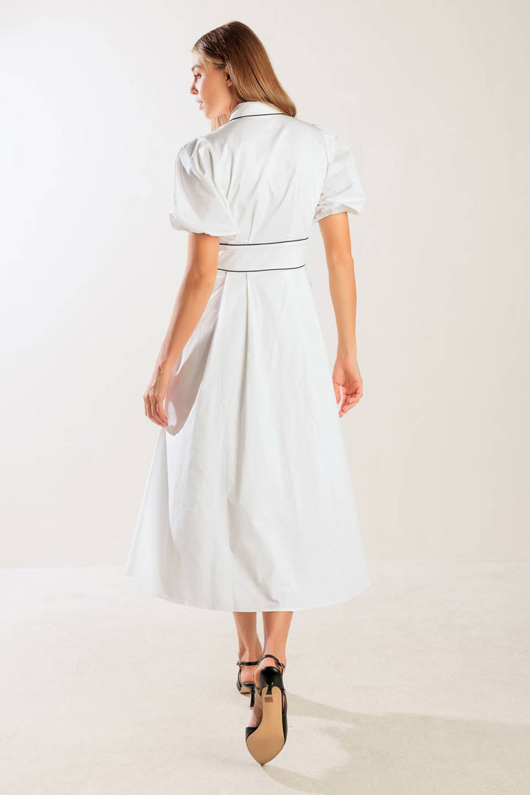 A solid woven midi featuring collar, button down, short puff sleeve, contrasting piping detail and full skirt