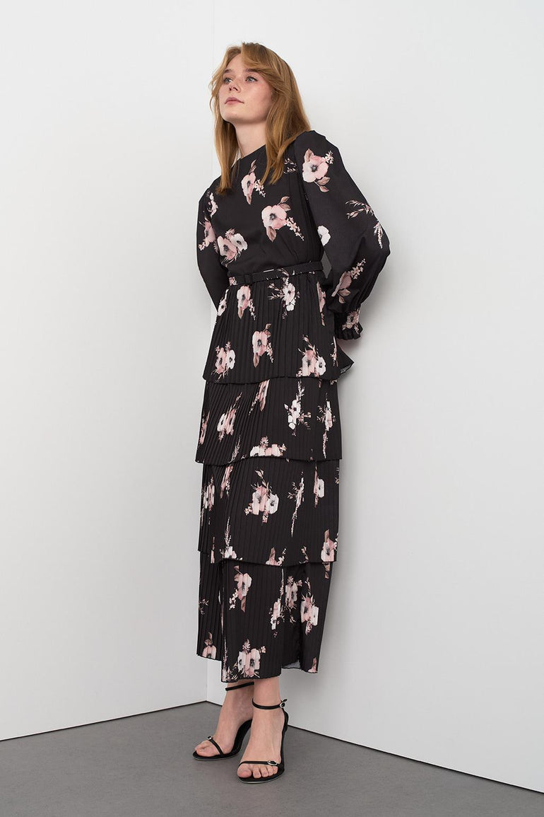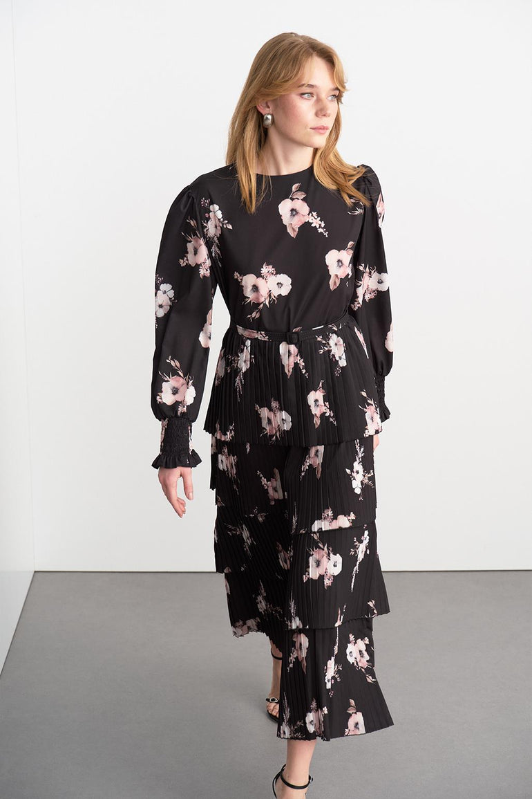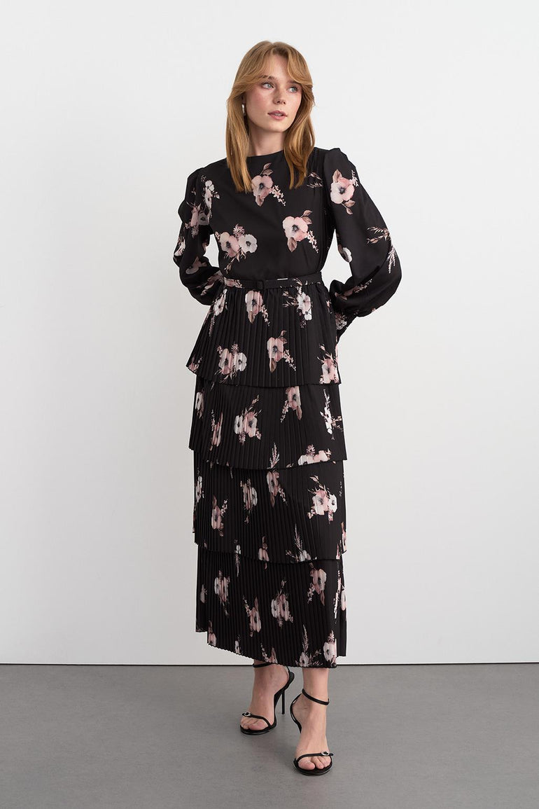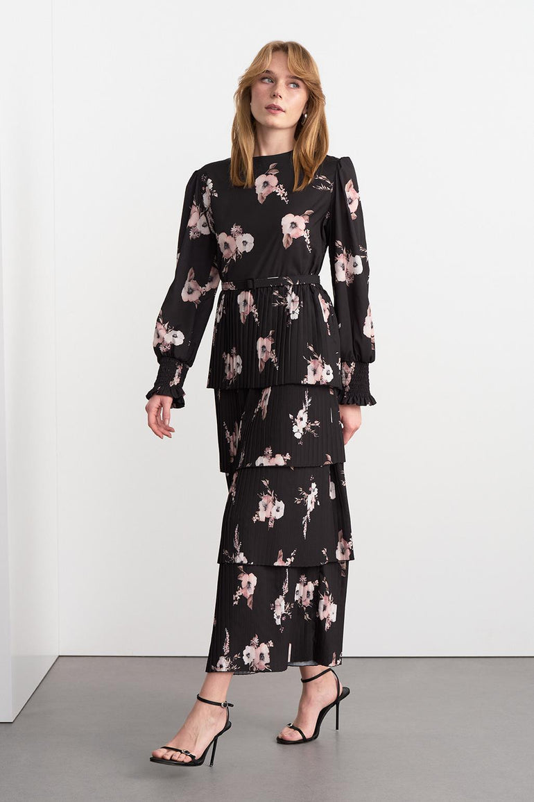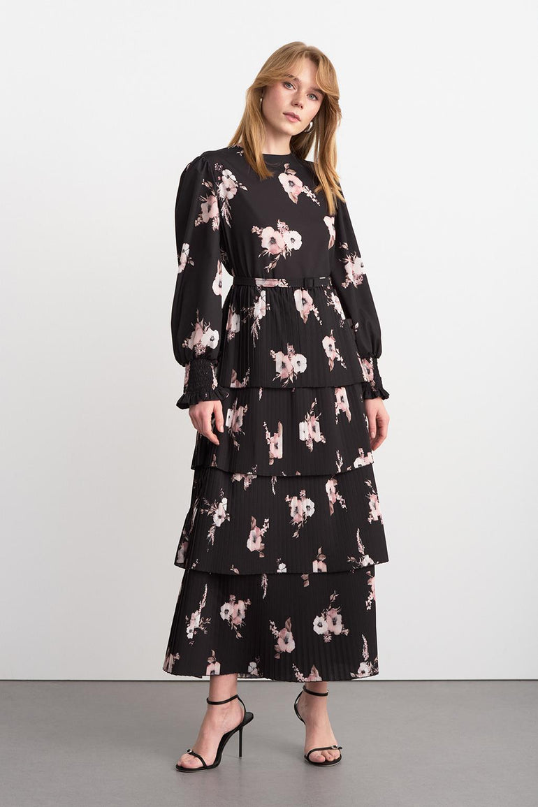 The Layered Pleated Long Dress in a floral print combines a soft crepe texture with delicate pleated details, offering both comfort and eye-catching design. Its flowing cut provides graceful movement with every step, adding lightness to your posture. The breathable fabric ensures all-day comfort, while this dress can be styled with sneakers for a casual look or with heels and minimal accessories for a romantic elegance on special occasions. A piece that seamlessly transitions from day to night, making you feel special at every moment!