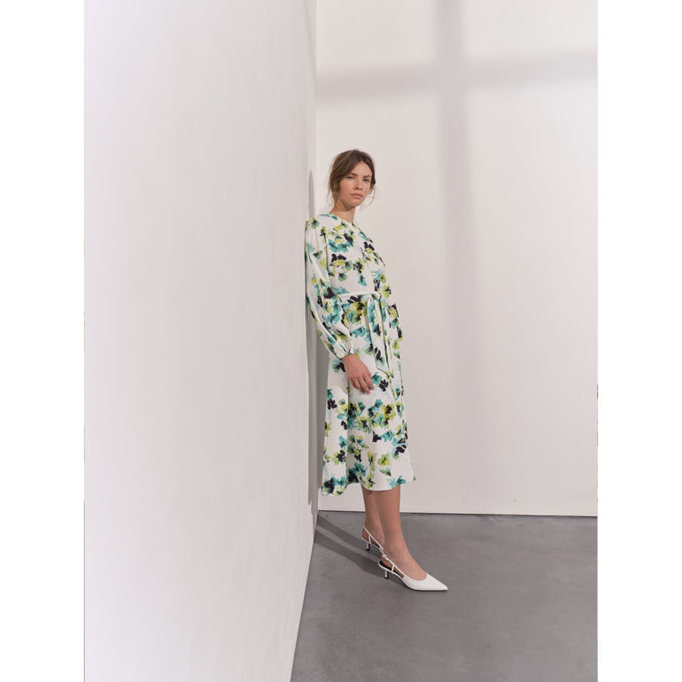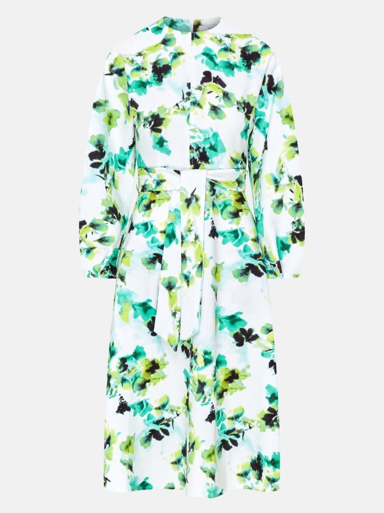 Our Maeve dress combines vibrant colours and striking patterns for a statement making look. The sleeves add a touch of drama and flowiness, while the belted waist cinches in to give the full skirt movement and flair. Whether for a daytime event or a night out, this dress promises to turn heads.