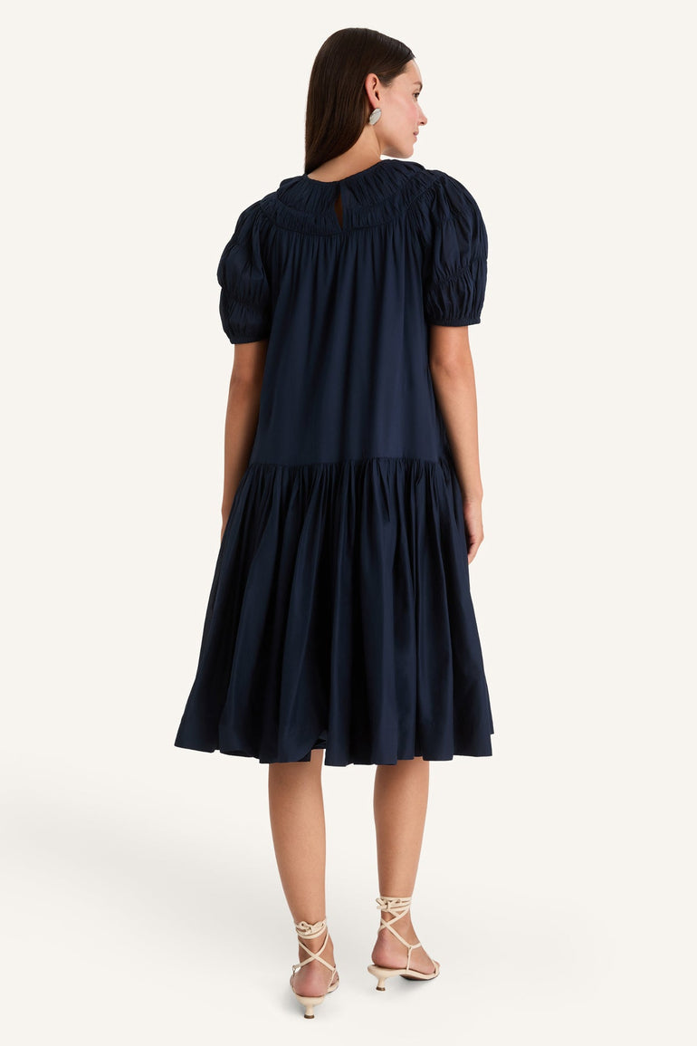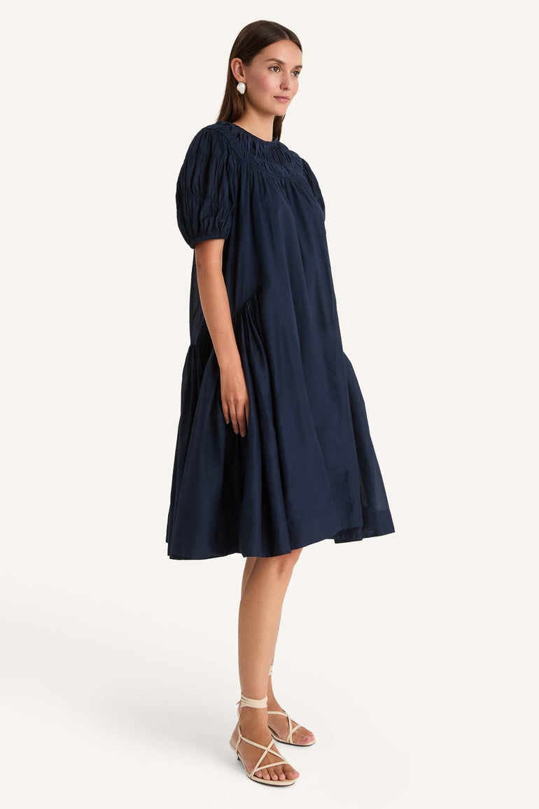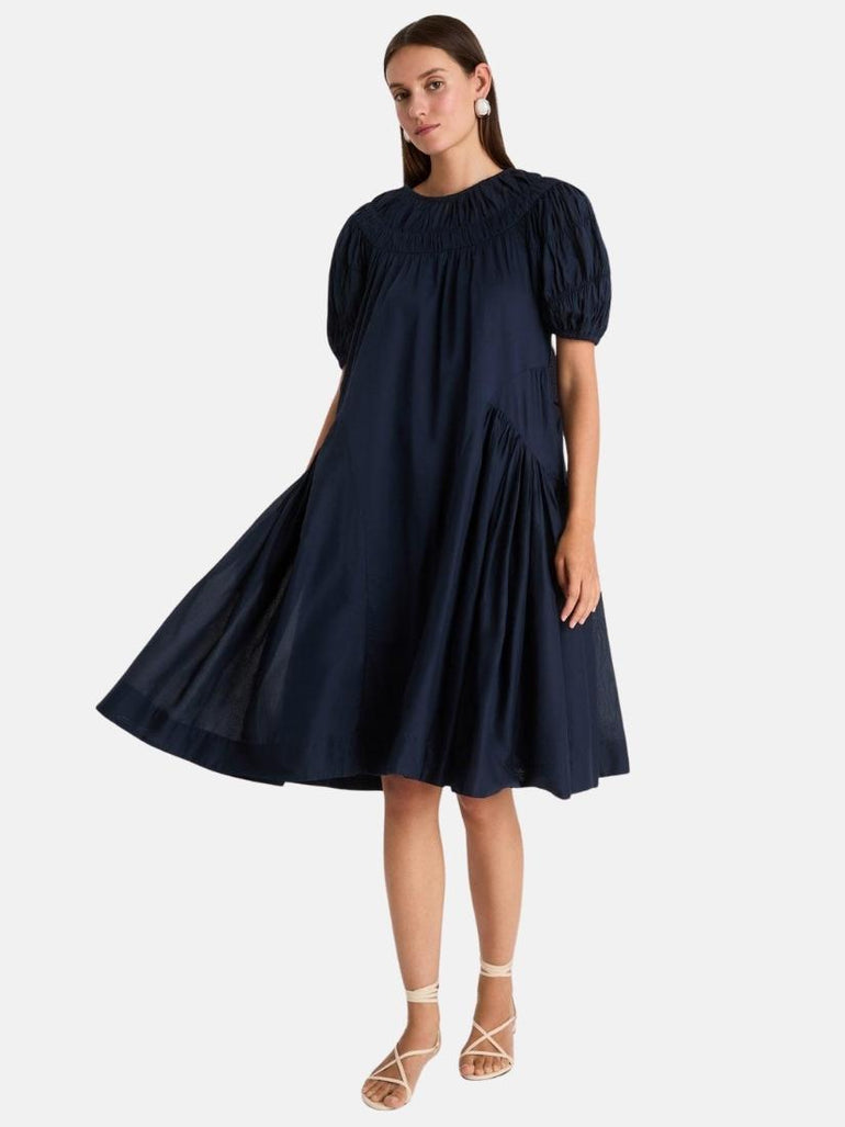 The MAIGRET Dress, a refined cotton voile piece, brings textural interest and movement to your wardrobe. Its knee-length silhouette is accentuated by a ruched yoke that flatters the figure. Gathered puff sleeves with elastic openings add a feminine touch, while the keyhole detail at the back neck offers an unexpected hint of allure.