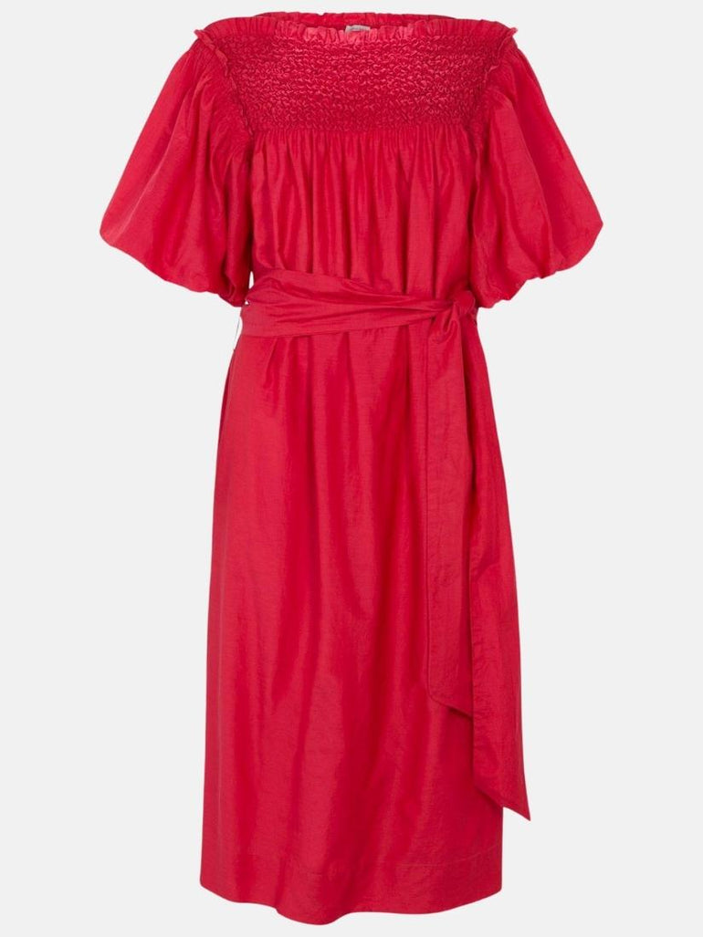 A lightweight silk-cotton midi dress featuring soft elastic smocking and an adjustable belt for versatile styling. Fully lined for comfort, it’s a romantic silhouette designed to move effortlessly from day to evening.