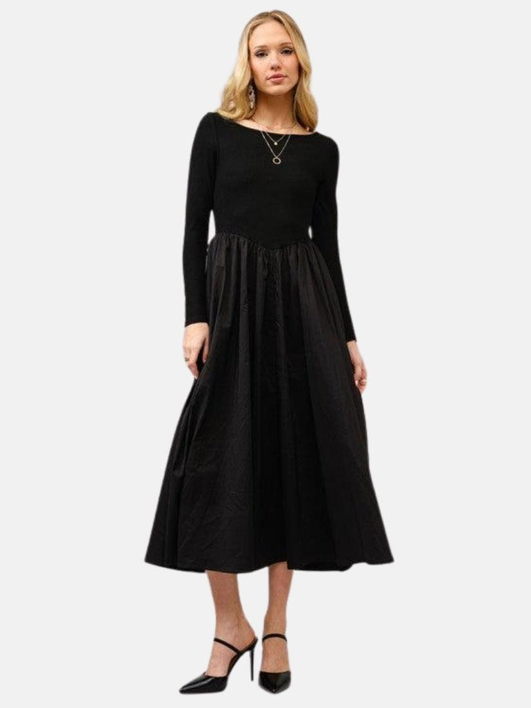 This chic dress showcases a V-shaped waistline and a boat neck style with contrasting accents, expertly fashioned from a plush ribbed material to enhance your figure and provide a cozy fit. Constructed with 95% Rayon and 5% Spandex
